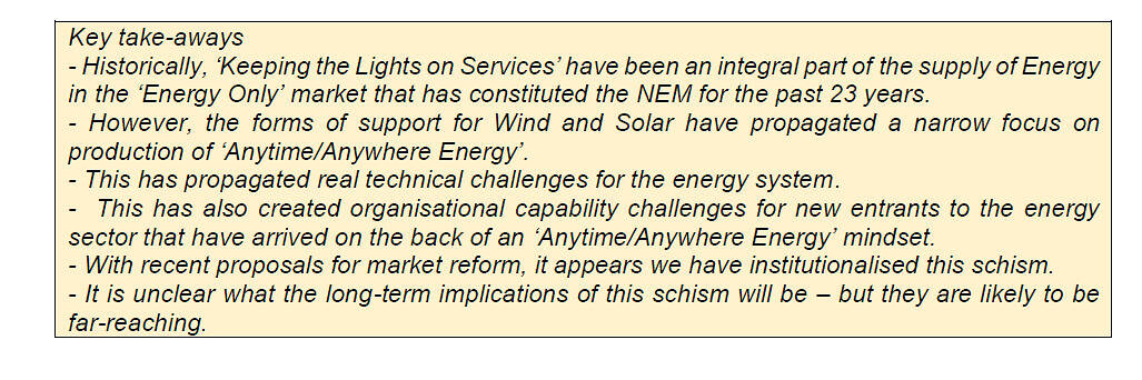In Theme 2 within Part 2 of the GRC2018, we wrote how ‘the NEM is developing an ‘us and them’ schism’ – with two commodities implicitly evolving (perhaps even diverging) within the NEM’s ‘energy only’ market structure, yet not explicitly supported in the central market rules: