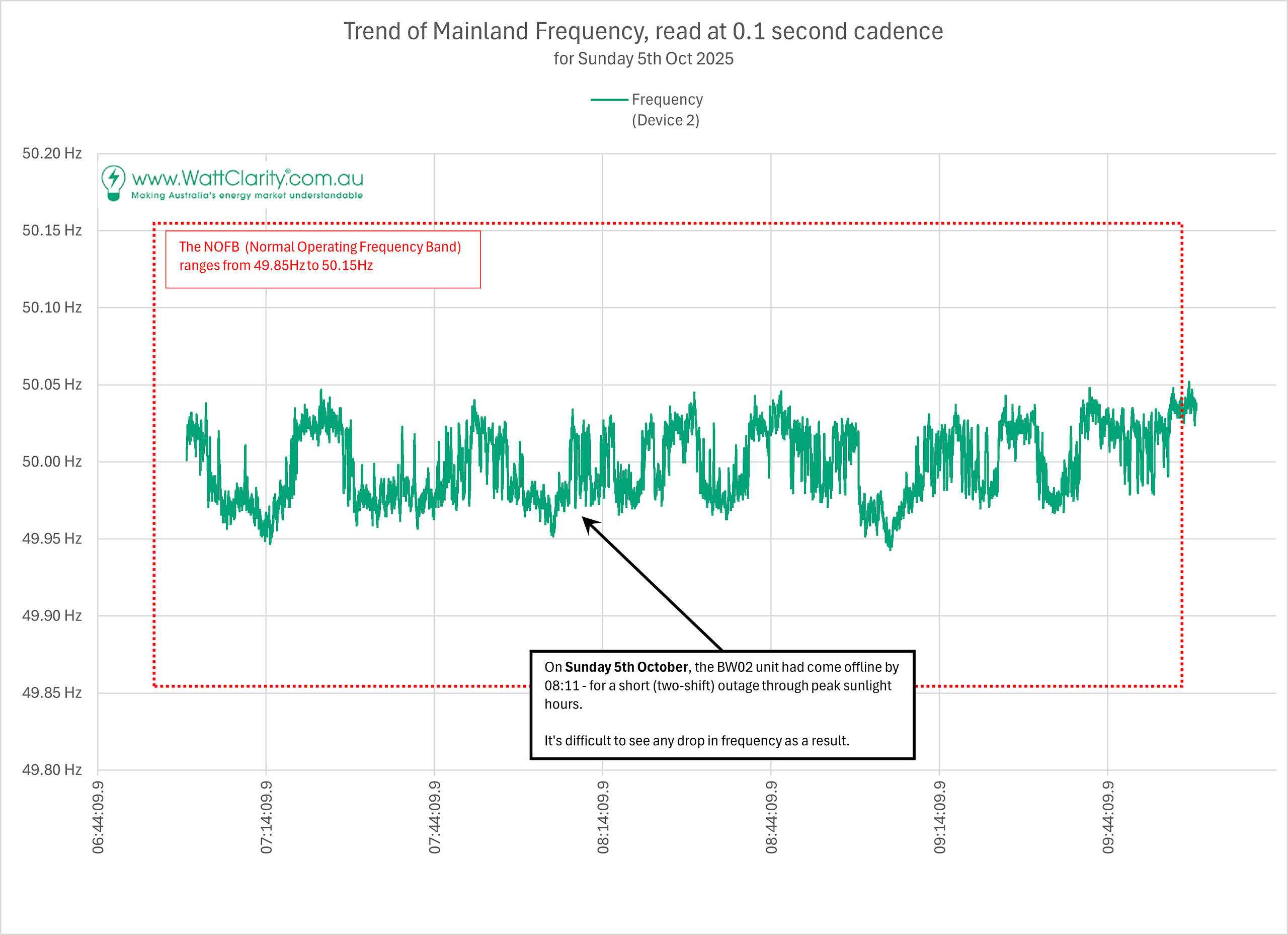 Be the first to comment on "Also difficult to see any fluctuation in Mainland Frequency on Sunday morning 5th October 2025, with BW02 offline (two-shifting)"