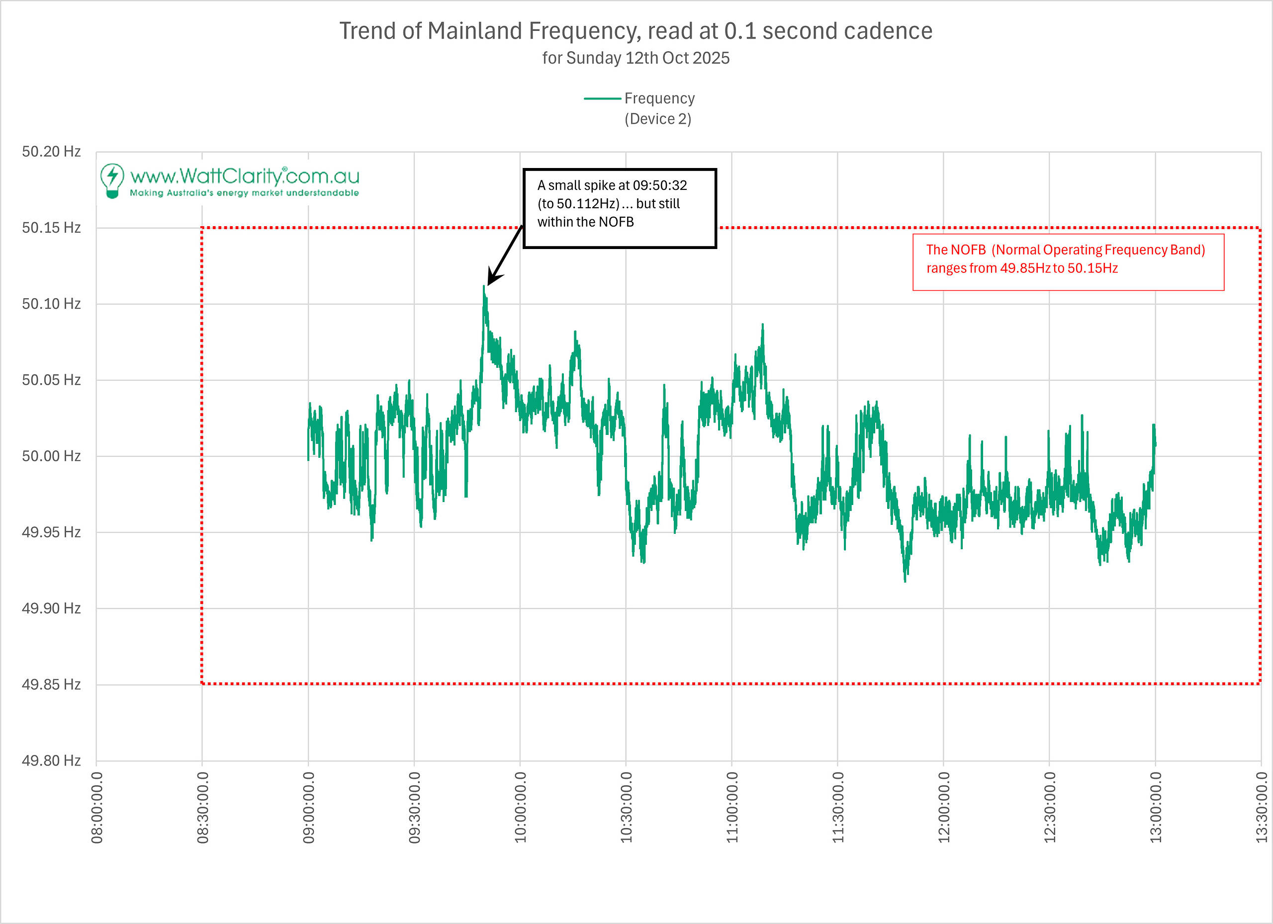 As something we might refer back to later, here’s a 4-hour trend of NEM Mainland Grid Frequency on Sunday 12th October 2025 – from 09:00 to 13:00 (NEM time):