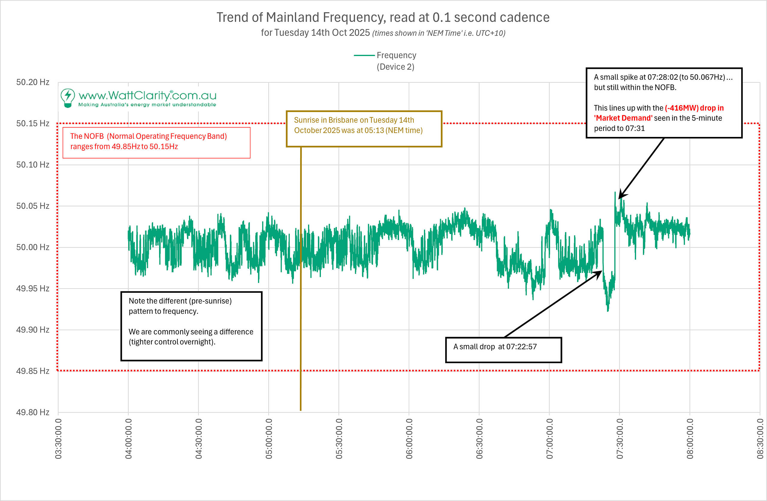With this extracted trend of mainland NEM system frequency (measured at 0.1 second cadence) it appears that there was some large(ish) trip in demand somewhere on the Queensland network, given the spike in frequency at ~07:28 on Tuesday 14th October 2025: