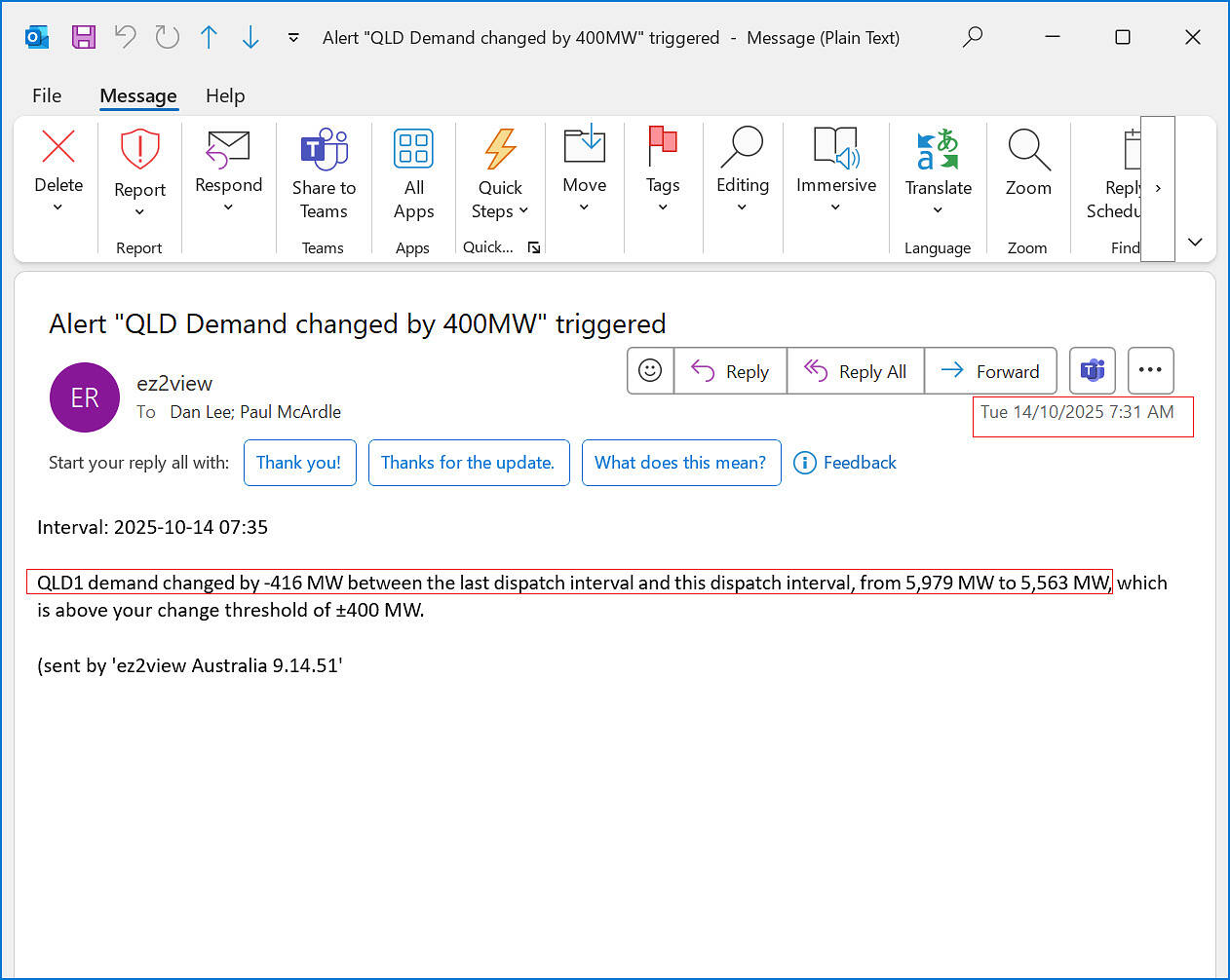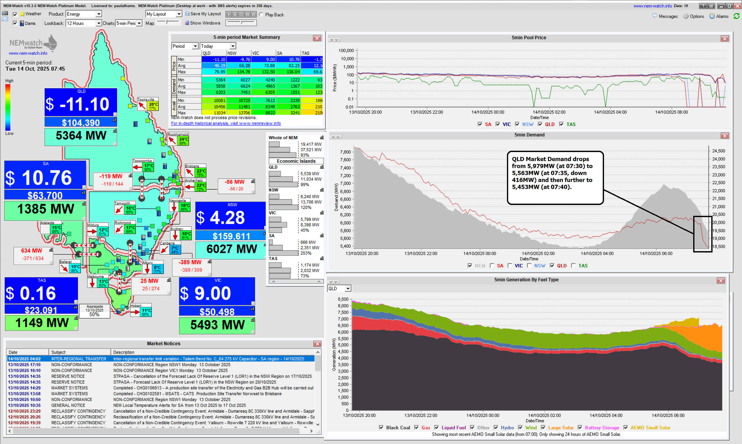 A short note to record a large-size drop in ‘Market Demand’ in the Queensland region on Tuesday morning 14th October 2025, as captured in this ez2view ‘Notification’ widget alert at 07:31 (NEM time):