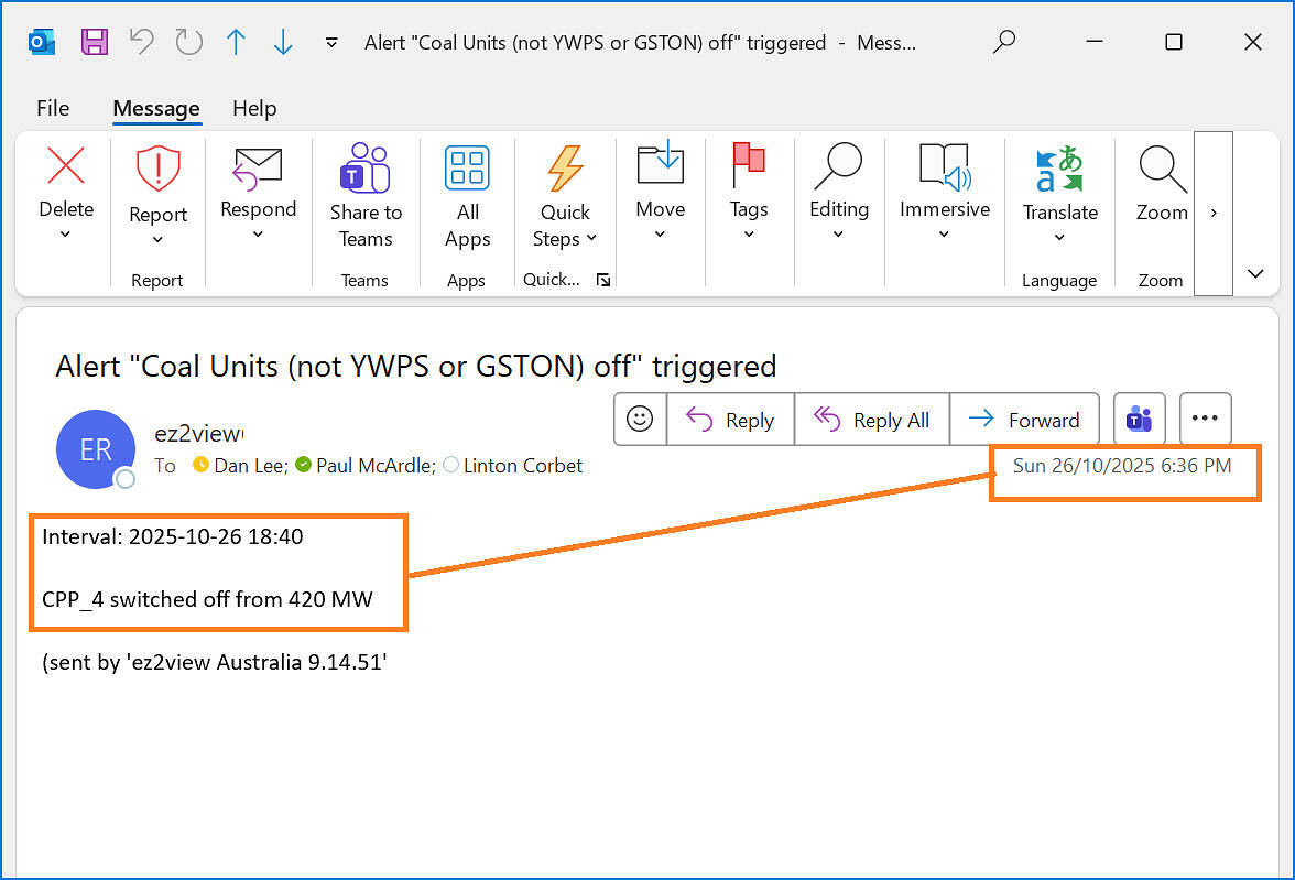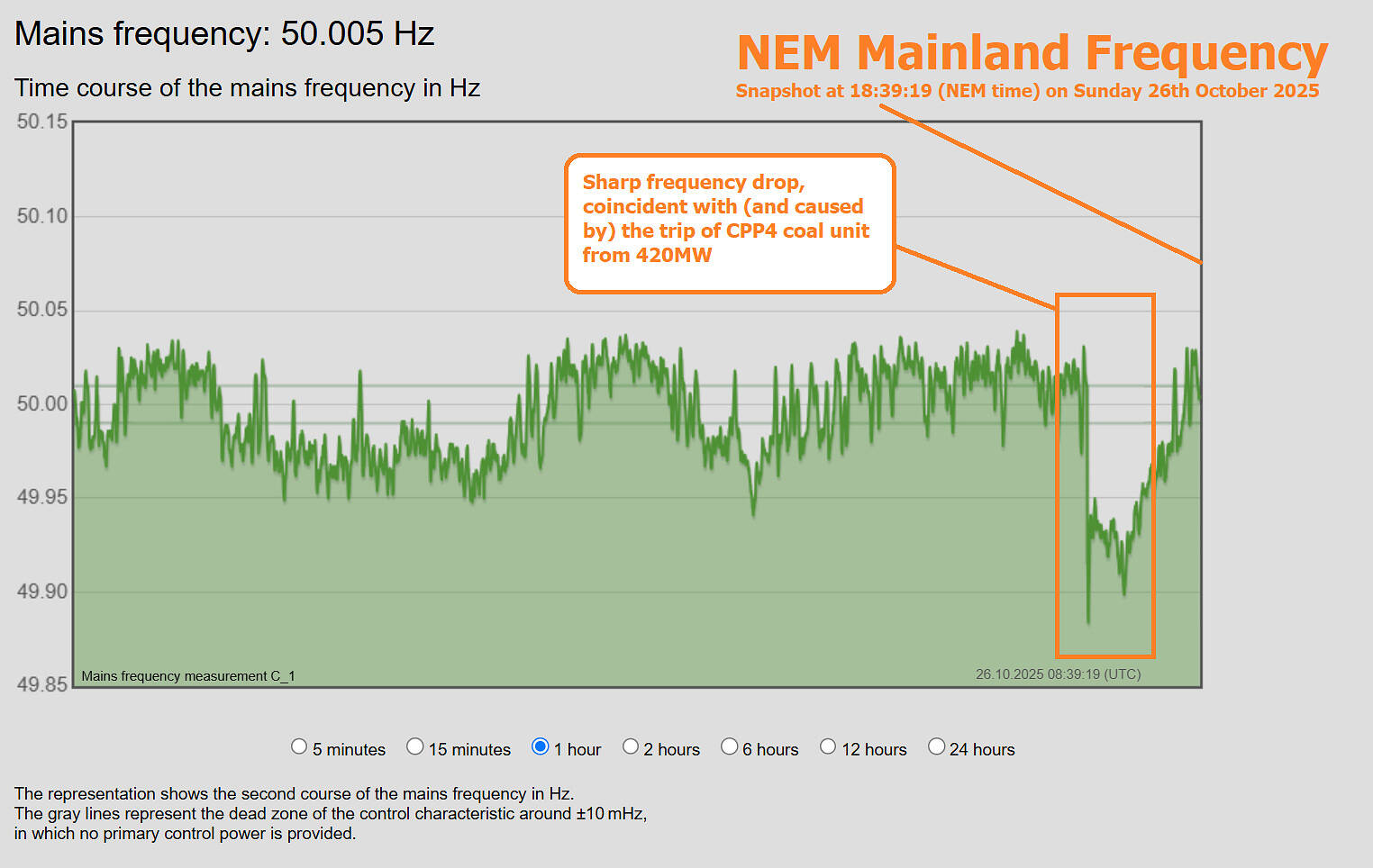 This drop in frequency was shortly followed (when the next Dispatch Interval rolled around) with this ‘Notification’ widget alert from ez2view to show that the Callide C4 unit had tripped from 420MW in the 5 minutes to 18:36 (NEM time) on Sunday evening 26th October 2025: