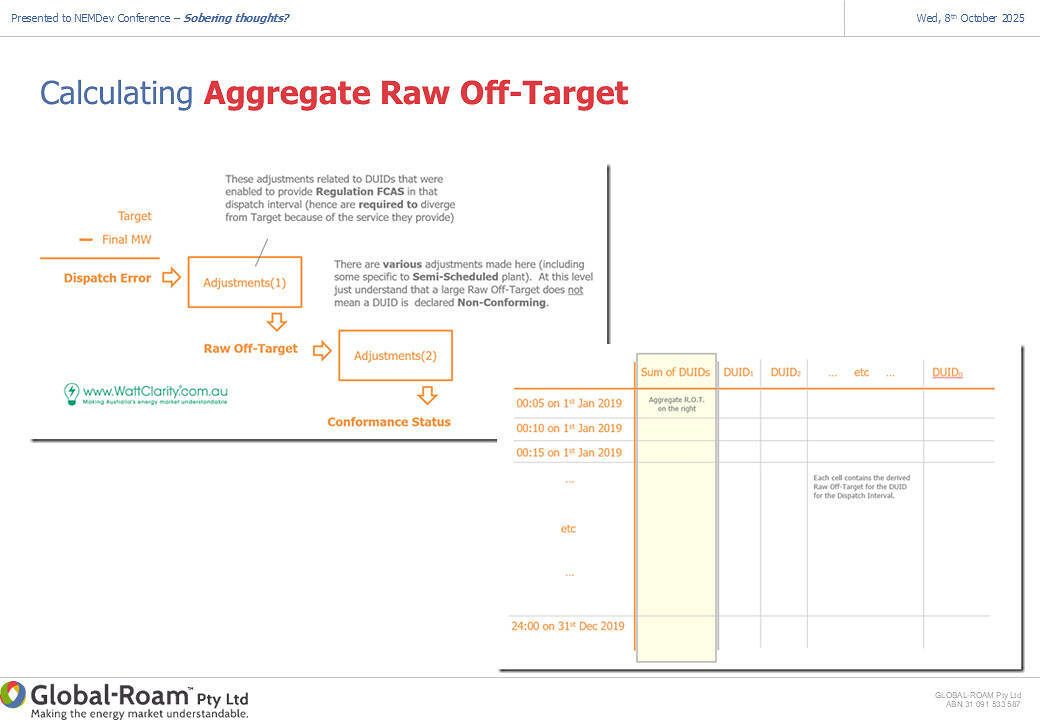 Let’s start by a refresher of the calculation of Aggregate Raw Off-Target (AggROT), and what that metric represents.  During NEMdev 2025, I presented this slide to summarise: