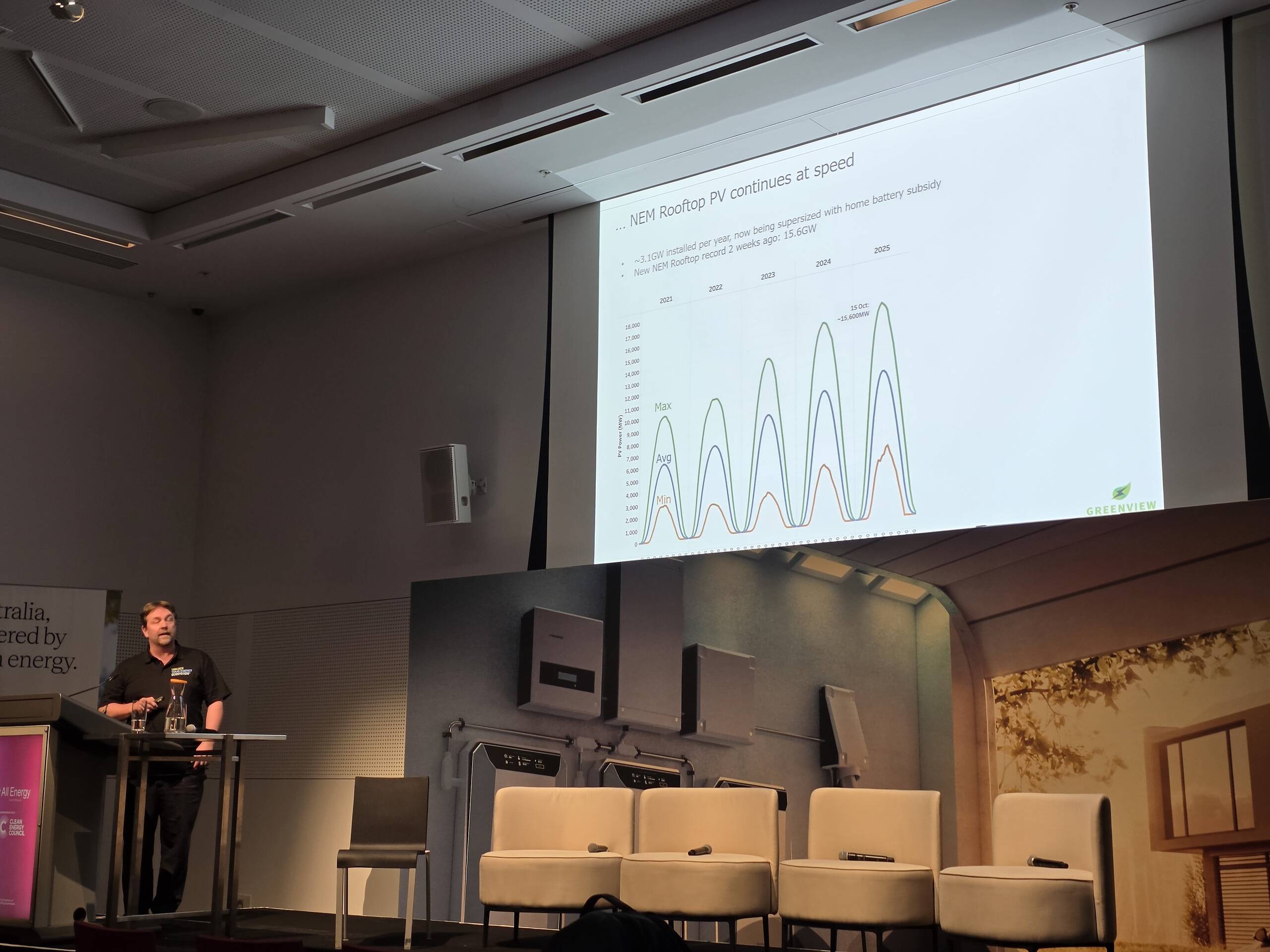 Wrapping it all together, Jon Dyson spoke about ‘The Reality train is heading our way : the easy bits are done’. No, not this train, but the one shown here: Many readers here will recall that we (at Global-Roam Pty Ltd) have worked closely with Jonathon Dyson and his Greenview Strategic Consulting team for ~10 years. So it was no surprise to me that Jon devoted some of his allotted time to emphasise the upsides (and the large challenges) represented by the rise of the rooftop PV juggernaut: With a high point for (estimated!) rooftop PV injections of ~15,600MW in the middle of the day on 15th October 2025 representing a particular case study in challenges. |