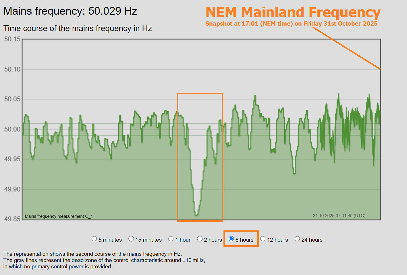 A short note with this snapshot of a 6-hour long frequency trace on Friday afternoon 31st October 2025, to capture what looks like another VRE-induced frequency wobble earlier this afternoon:
