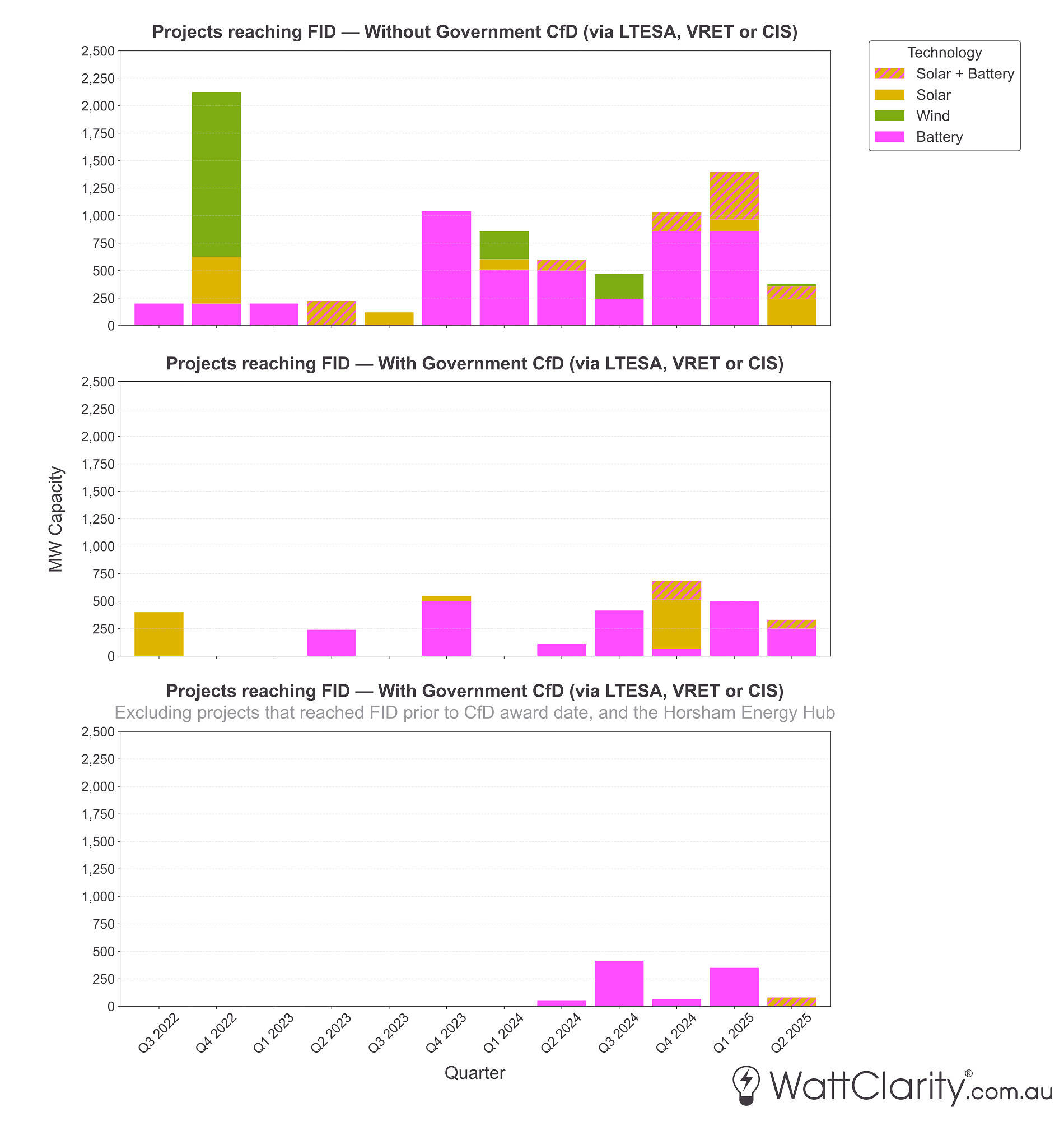 As the charts show, only a small portion of the projects participating in the tenders have reached FID since being awarded their contracts. And among those that have, most are battery or solar-battery hybrids — the same project types that are also proceeding without government support. This demonstrates that batteries are driving much of the current investment momentum in the market, regardless of whether they have government support.