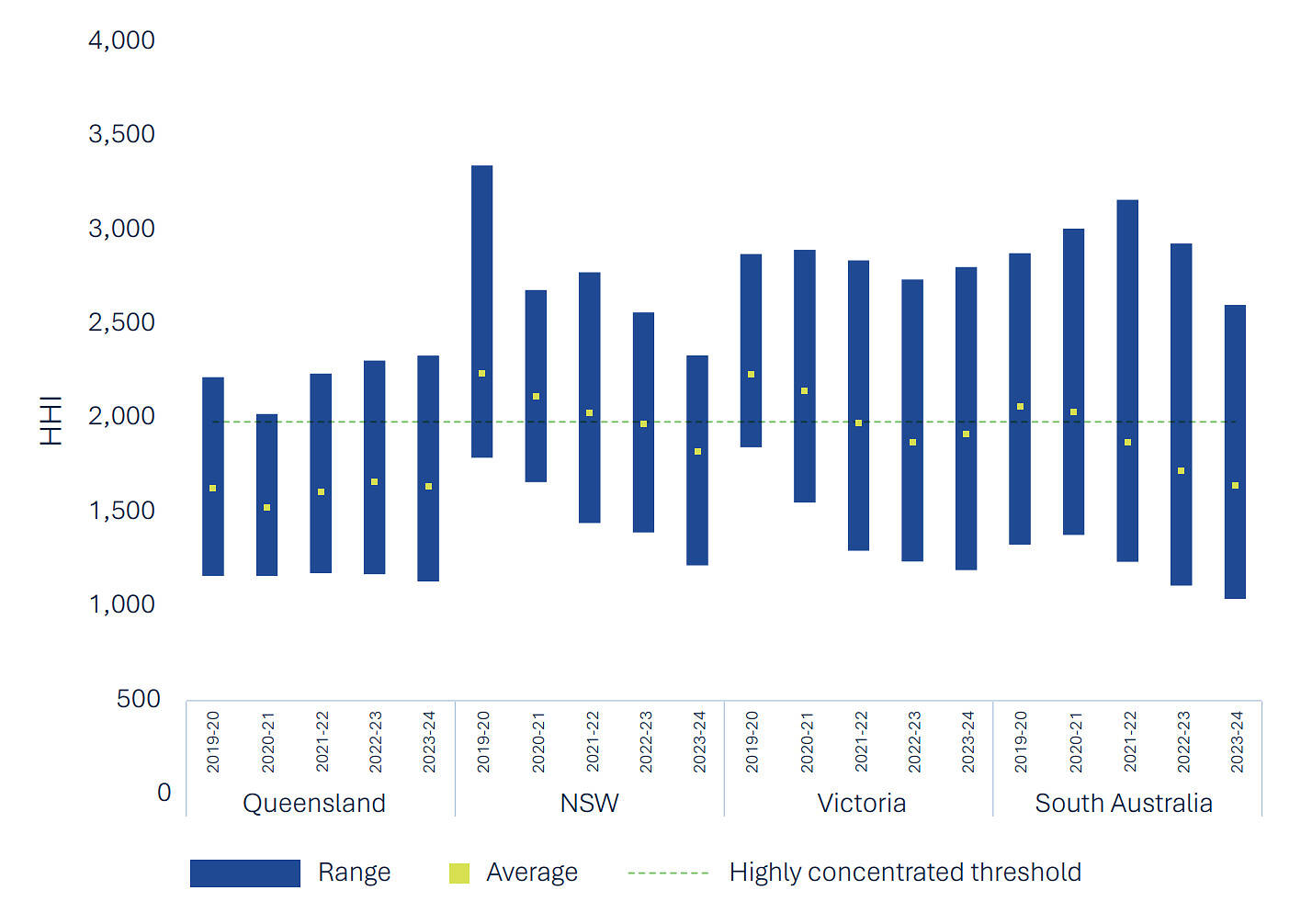 As covered in other posts, one of the most critical things for the effective functioning of the NEM is competition (unless you ask the Electricity Networks Australia…). Since its inception, there have been large players that have maintained dominant positions. The graph below points to the historically concentrated markets for generating electricity (taken from the Nelson review). Sitting about the green dotted line suggest a market that is highly concentrated.