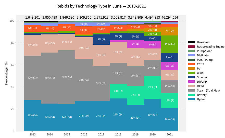 However, this also isn’t just a battery problems. There has also been a huge growth in the rebids from PV, wind, demand response/virtual power plants as well as batteries. In 2021, they were collectively responsible for over 40% of the rebids, and all of them are likely heavily reliant on bidding platforms.