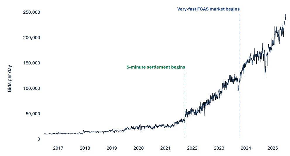 Noting the points raised in Abhi’s paper (which is a great read), there is a case to go the other way. The generation mix is changing. Clunky, old, stable coal units are being replaced with variable generation and highly controllable storage. It makes sense that there will be more bidding and rebidding. Restrictions of rebidding risk curtailing the flexibility in the fleet of batteries. Conversely, reducing regulation around rebidding could allow for a more optimal use of the fleet of BESS.