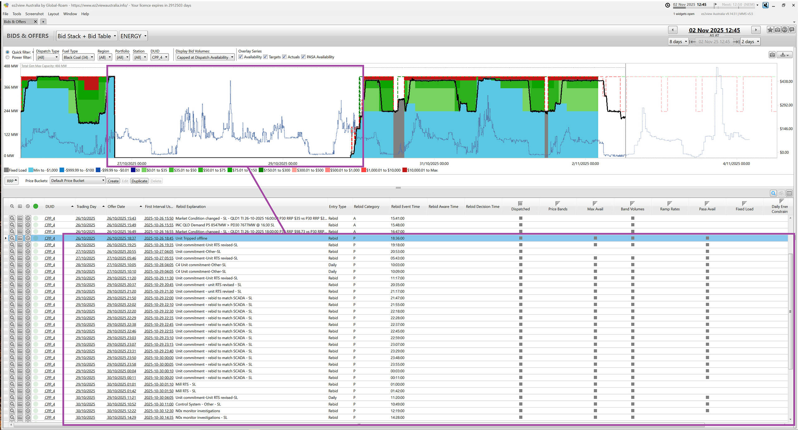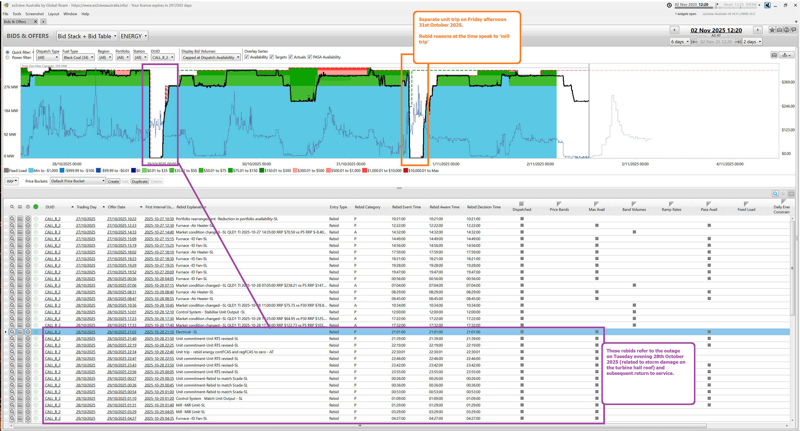 Given I had the ‘Bids & Offers’ widget already opened in ez2view, I thought it might be useful to flip to these two coal units to check what was visible in the market data: