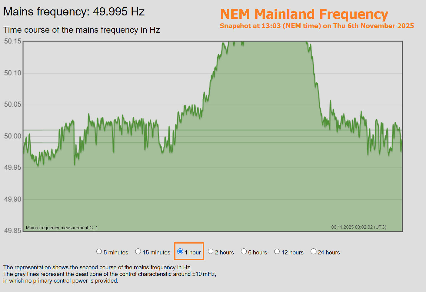 Looking back at system frequency, we see a noticeable drop in system frequency around ~15:45 (NEM time) on Saturday 5th October 2024.