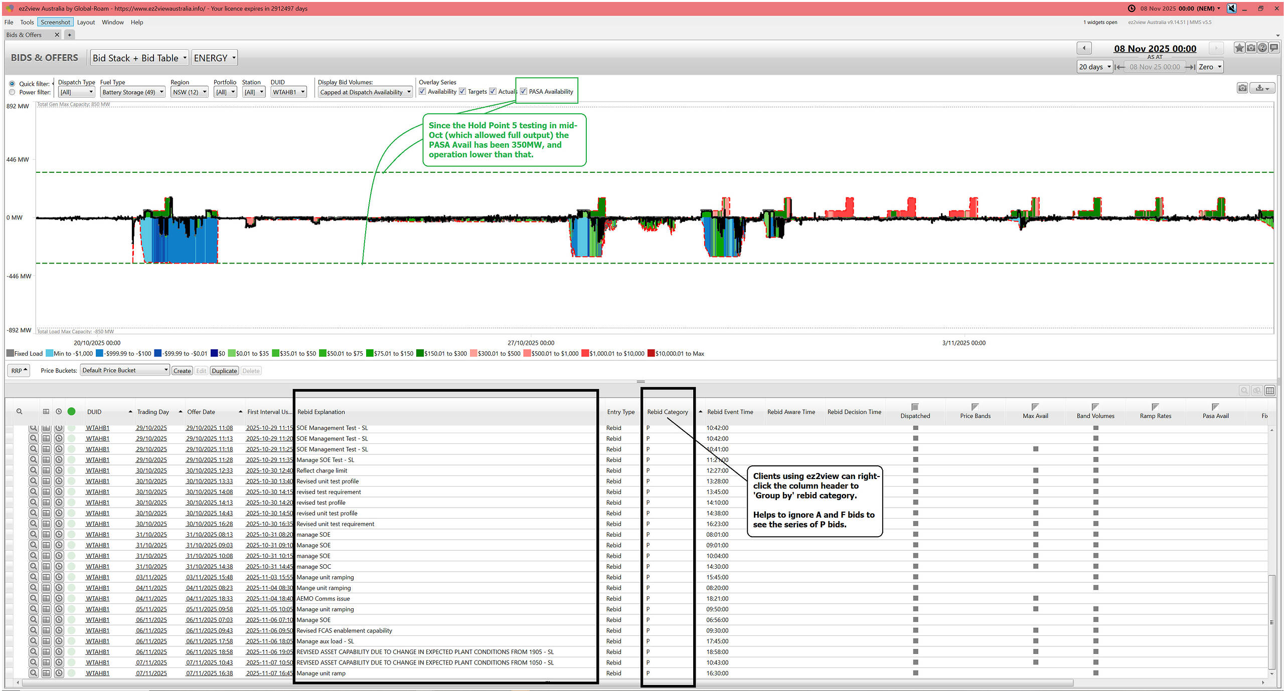 … there were a few things to see in that data, which go some way to helping answer the questions we have, so we shared as ‘A quick look at (plant-related) rebids for Waratah BESS to 19th October 2025 (during Hold Point 5 testing for full discharge)’.