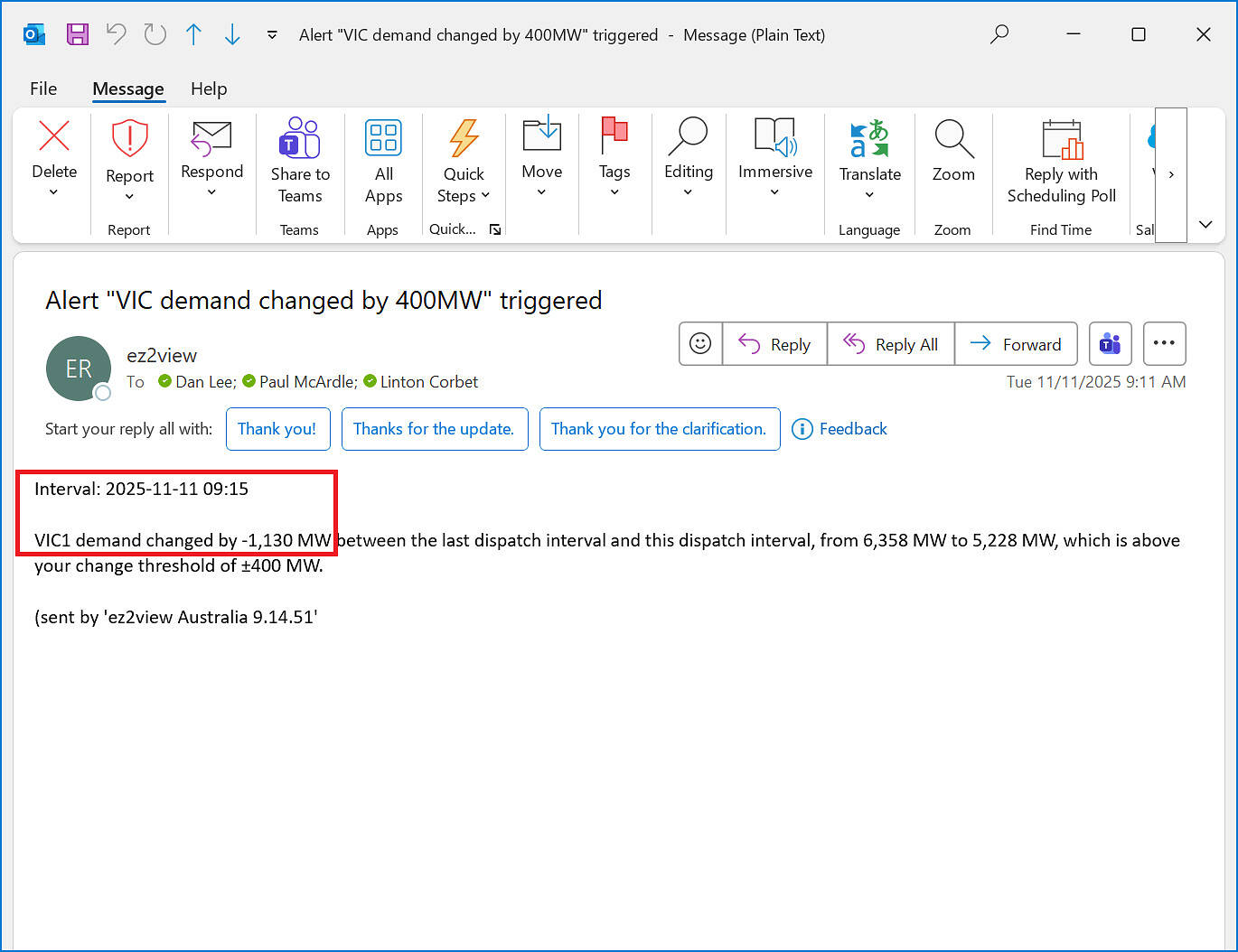 To help with timing of the incident, I’ve added in here this capture of a ‘Notification’ widget alert triggered at 09:11 (NEM time) from our ez2view software that speaks to a very large drop (1,130MW) in ‘Market Demand’ for the 09:15 dispatch interval.