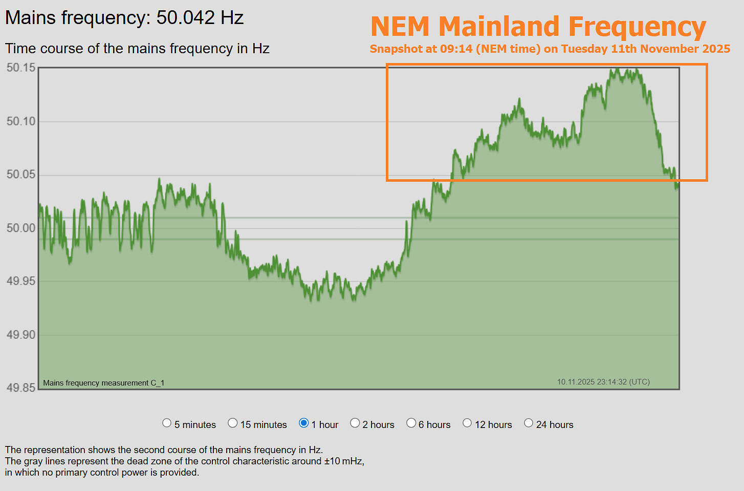 Here’s the a snapshot of the live frequency monitoring take in Brisbane at 0.1 second cadence: