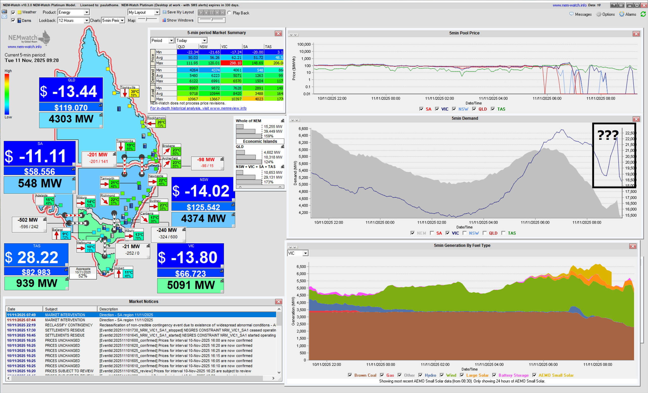 … and here’s a snapshot of NEMwatch at the 09:20 dispatch interval (NEM time):