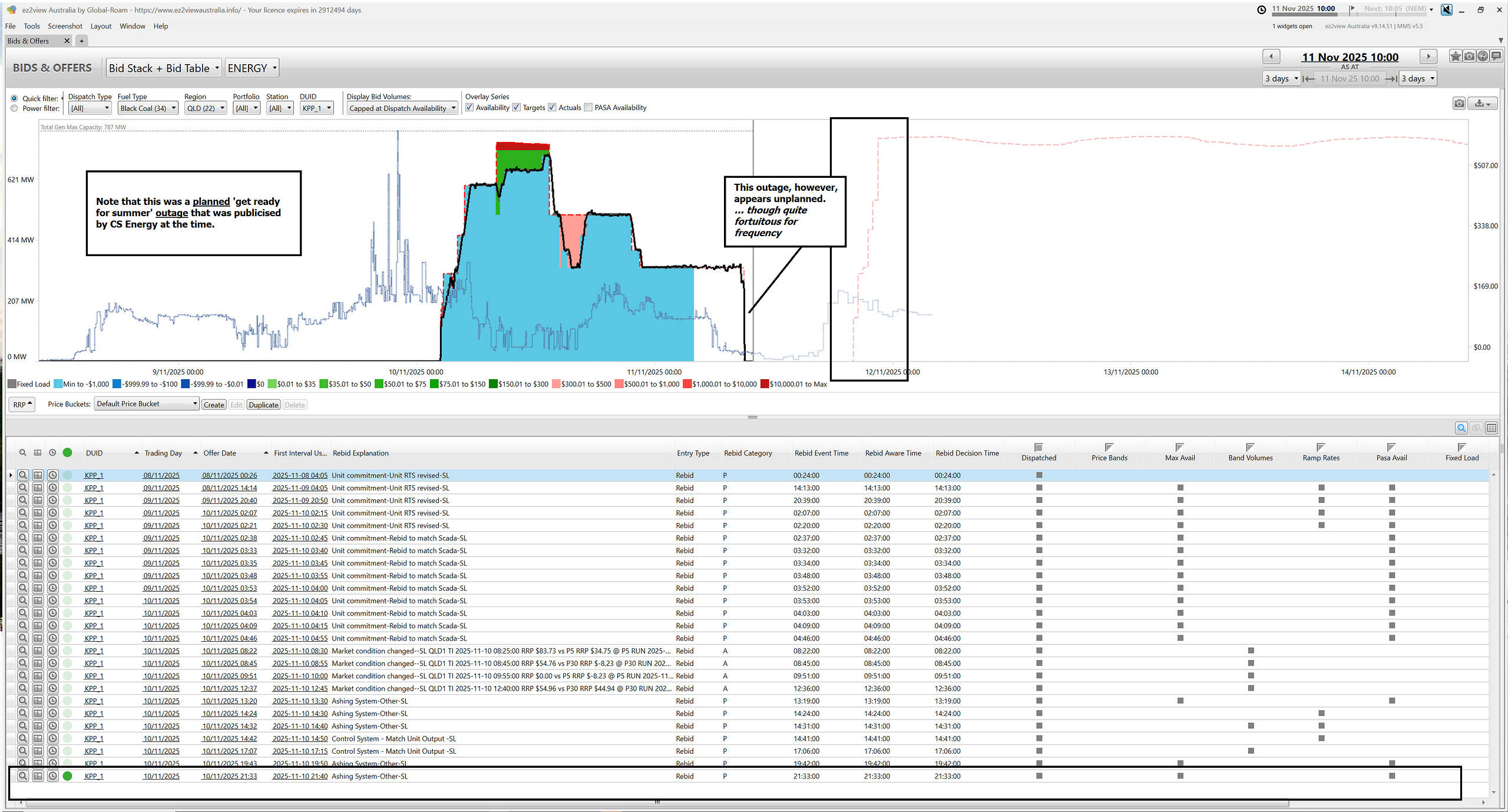 In the snapshot from the ‘Bids & Offers’ widget from ez2view, we see that the unit tripped this morning – but that the current expectation (via the PD/ST PASA data that’s been publicly accessible since late July 2025), the expected return to service is currently this evening.