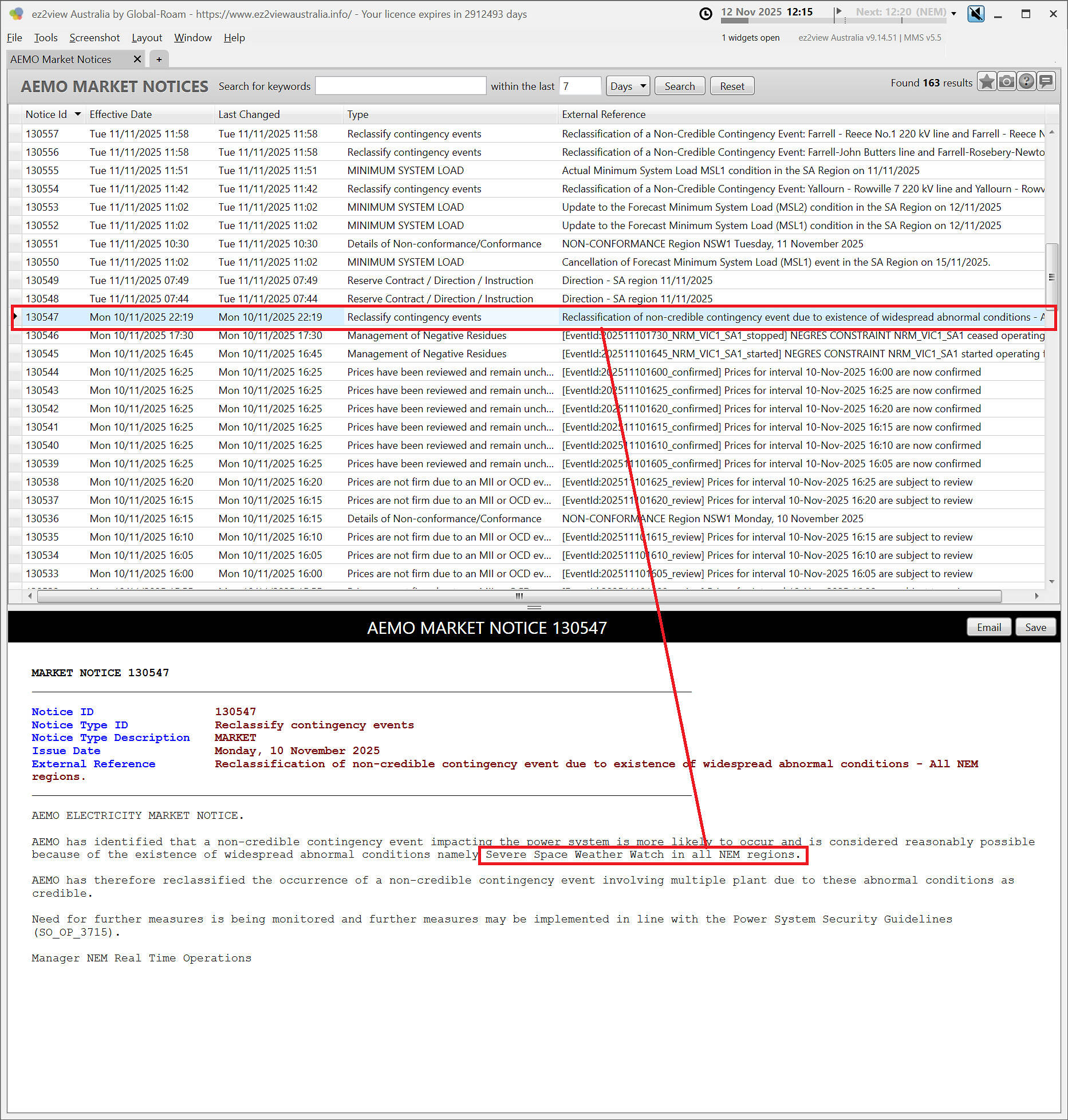 One of our keen readers has reminded us that on Monday evening 10th November 2025, the AEMO published MN130547 warning about possible ‘Severe Space Weather’
