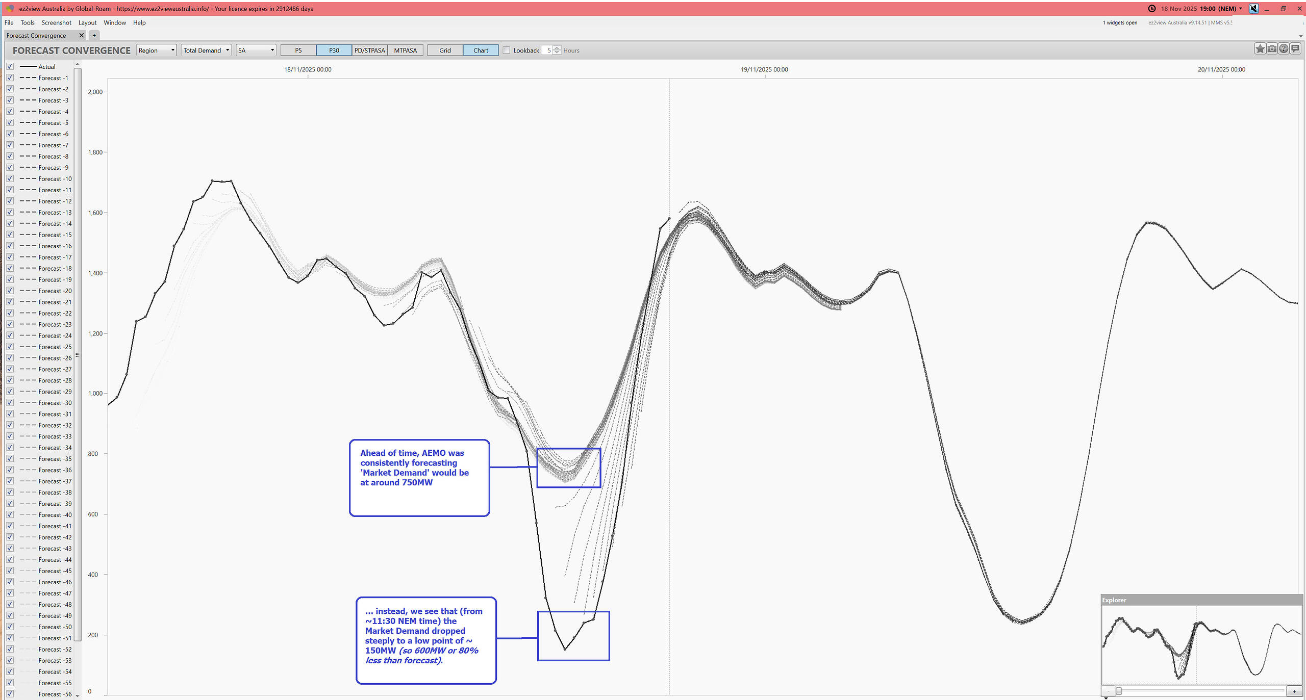 A quick article this morning to sum up one of the more difficult days in forecasting ‘Market Demand’ in South Australia for yesterday (Tuesday 18th November 2025), clearly visualised in this snapshot from the ‘Forecast Convergence’ widget in ez2view, time-travelled back to 19:00 (NEM time) yesterday, when the show was over: