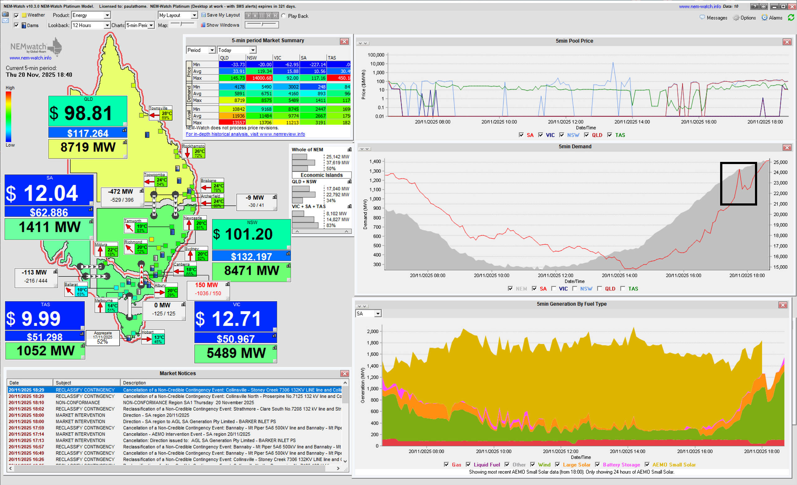 A quick note on Thursday evening 20th November 2025 to record this large size (214MW) drop in ‘Market Demand’ in the 17:50 dispatch interval NEM time this evening: