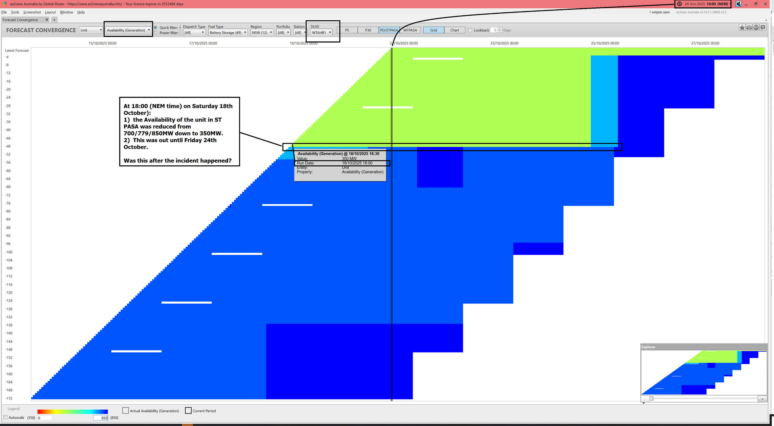 1) We can see that there was a change in the MT PASA DUID Availability data update for 18:00 NEM time on Monday 20th October 2025