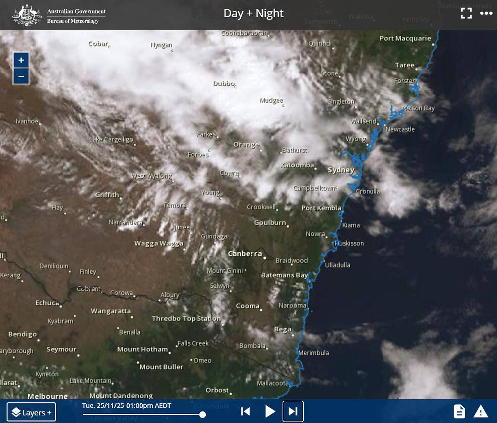 The quick rise in market demand in NSW appears to have coincided with a large cloud bank drifting west-to-east across the Sydney metropolitan area — cutting rooftop PV output across the region’s largest population centre. This reduction in behind-the-meter generation would have flowed through to higher (net) market demand.
