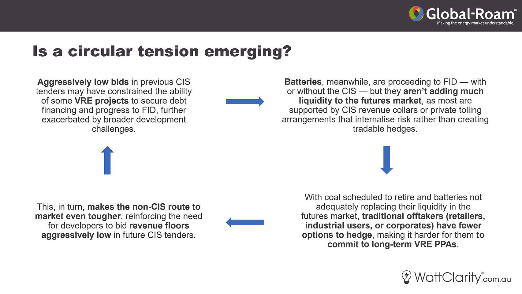 One of the final slides in our presentation posed a question about whether a feedback loop may be forming between CIS bidding behaviour, the contracting of batteries, and the liquidity needs of offtakers. The idea — framed only as a hypothesis — can be summarised as follows: