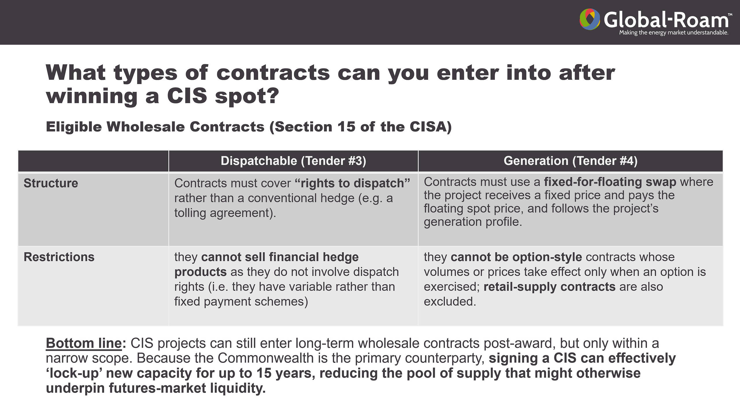 In this slide from our presentation on Wednesday, we summarised the key elements of Section 15 of the CIS Agreement (CISA) to clarify what types of wholesale contracting arrangements are permitted after a project wins a CIS contract. In practice, the CISA restricts proponents largely to tolling-style arrangements or fixed-for-floating swap–style arrangements. These constraints mean that projects may be more limited in how they participate in, and support, the broader contract market.