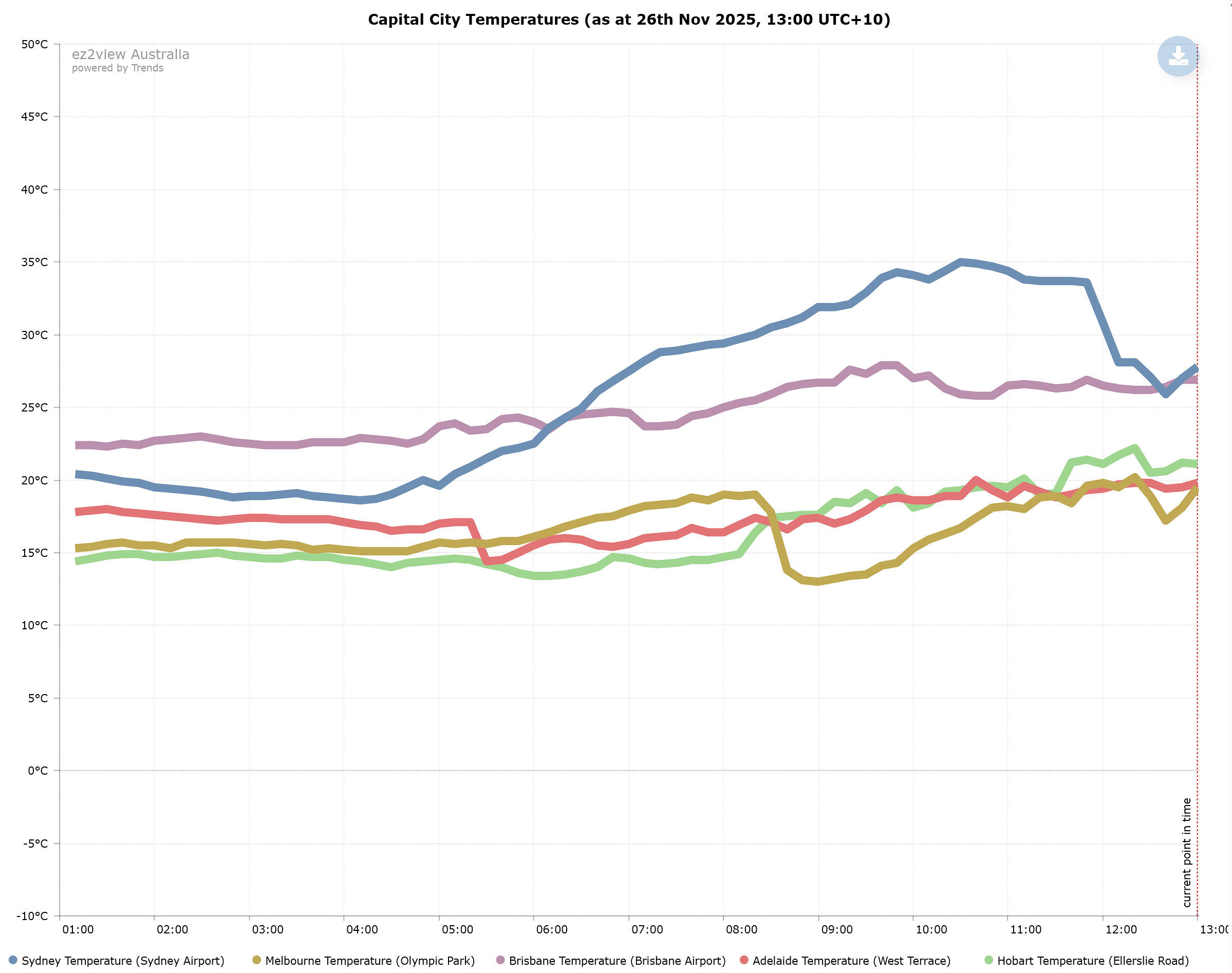 The day began quite warm in NSW, with temperatures at Sydney Airport already above 30°C by 8:30am NEM time (9:30am local time), before cloud cover and storms moved in and eased conditions just around 12:00pm NEM time.