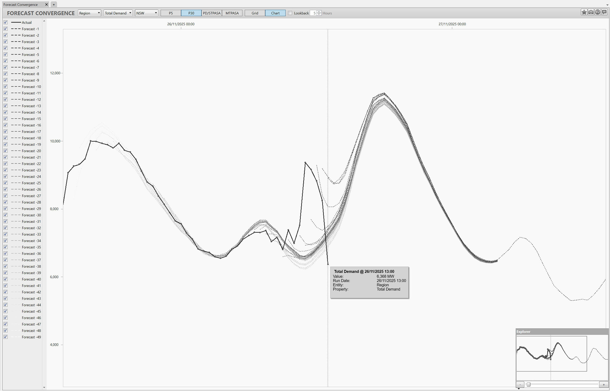 The dark solid line shows actual market demand in NSW, whilst the faded dotted lines shows each prior P30 forecast – highlighting the challenging conditions today for the AEMO’s operational forecasting team.