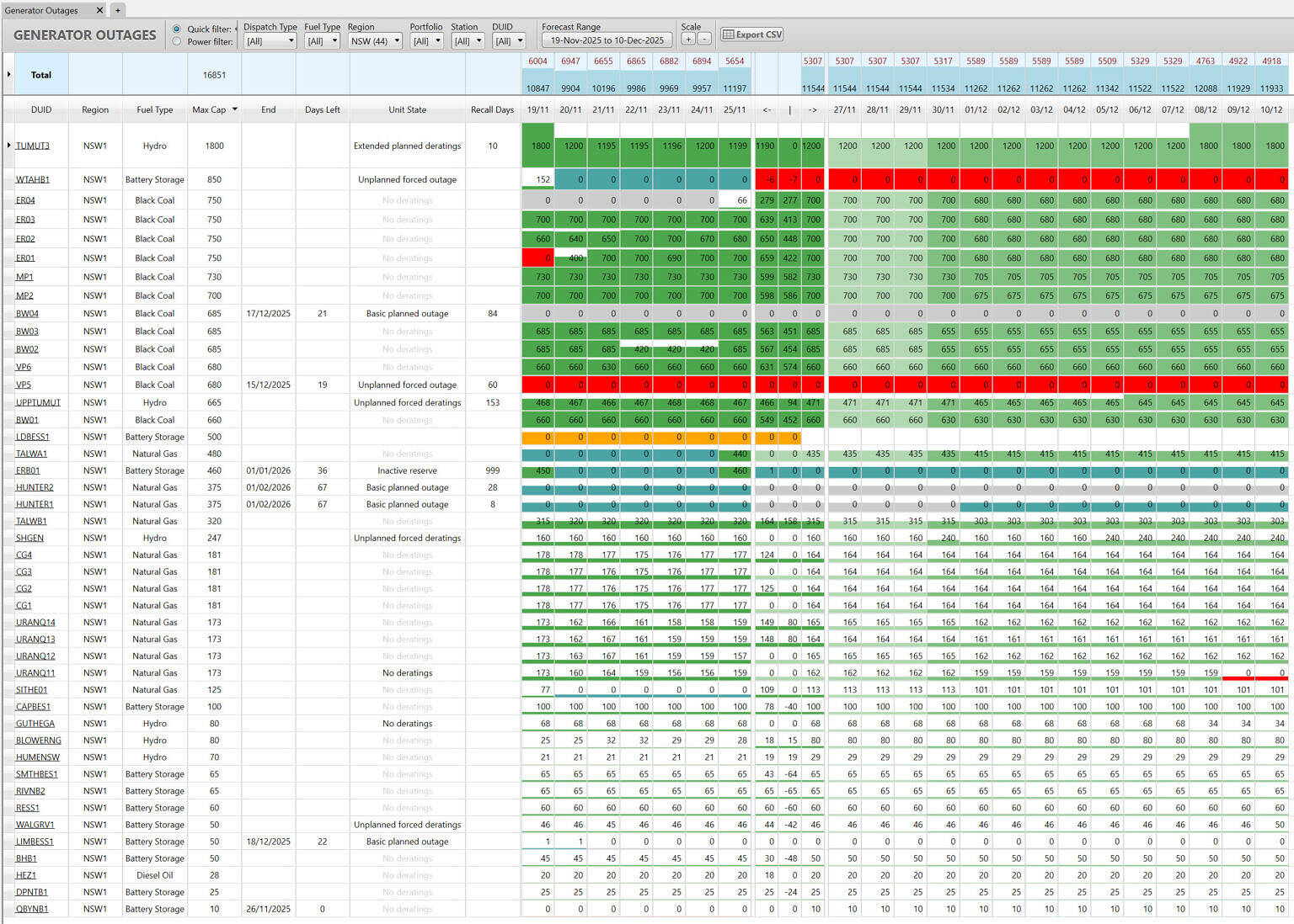 In the screenshot above we can also see longer-term outages at the 685 MW Bayswater Unit 1 and the 680 MW Vales Point Unit 5, both of which are still weeks away from their planned return to service.