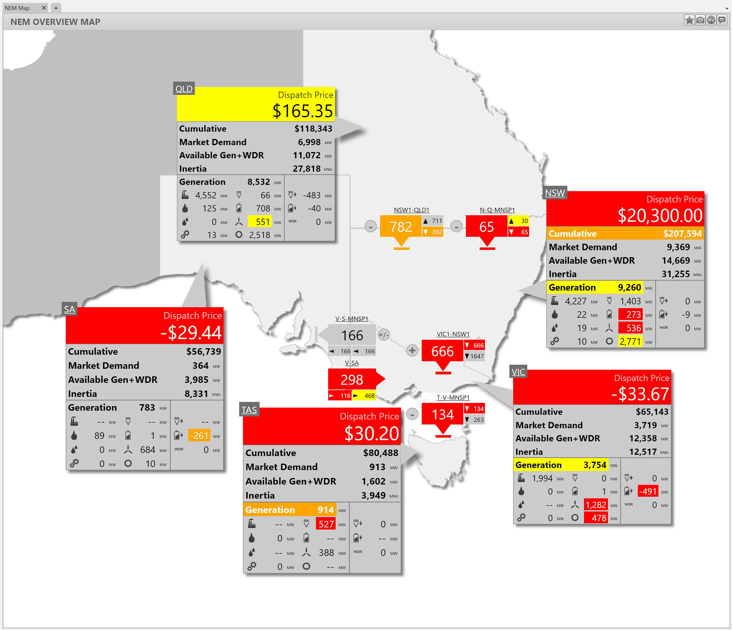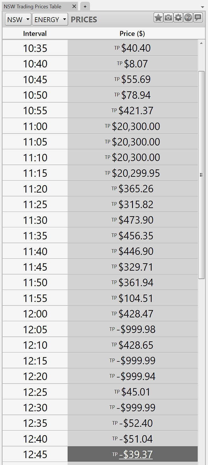 At the 11:00 dispatch interval (12:00pm in Sydney), the NSW spot price spiked up to the Market Price Cap (MPC), holding there for three more intervals before dropping. Around an hour later, from the 12:05 dispatch interval, it sank to almost the Market Price Floor (-$1,000/MWh).