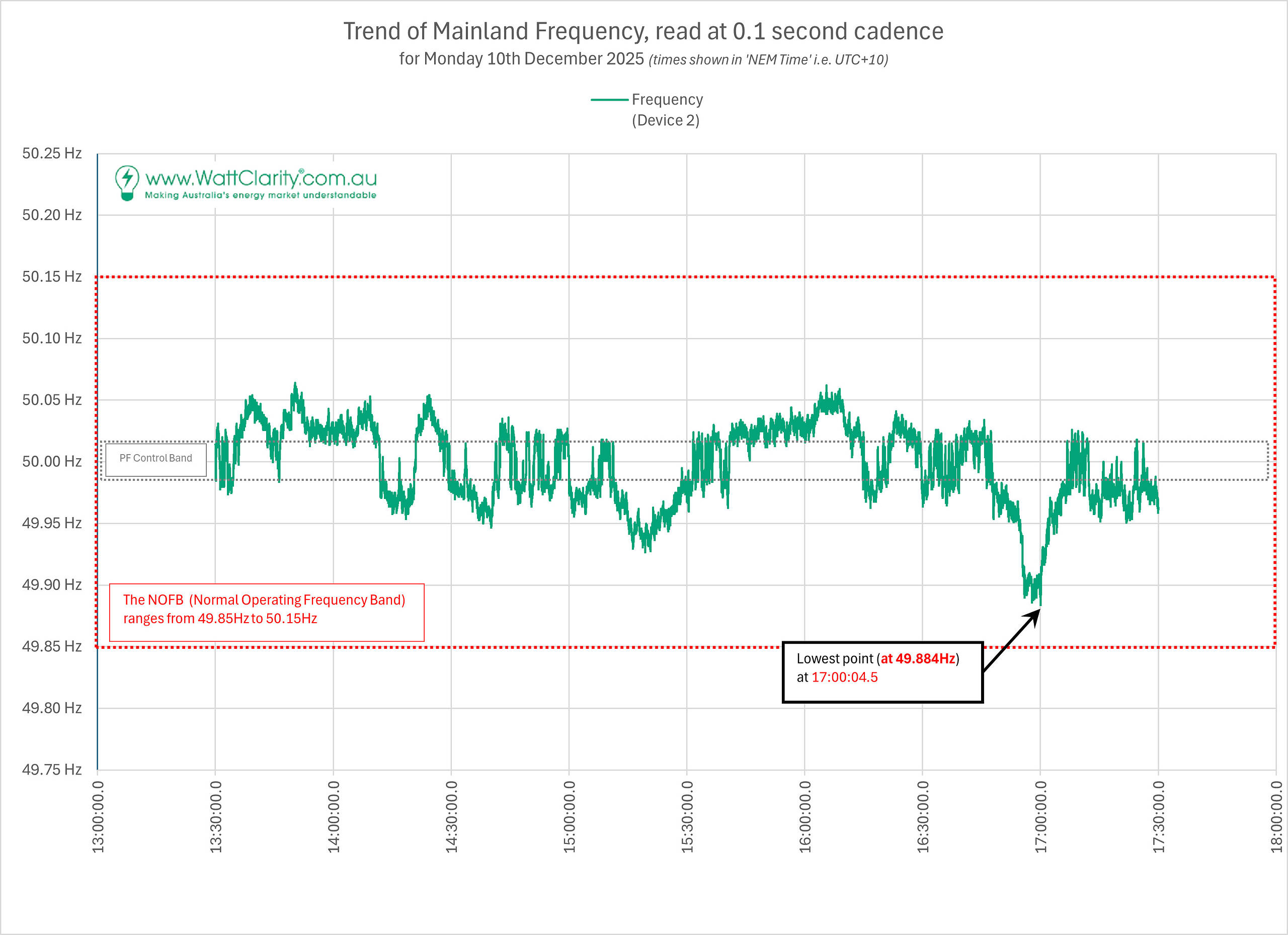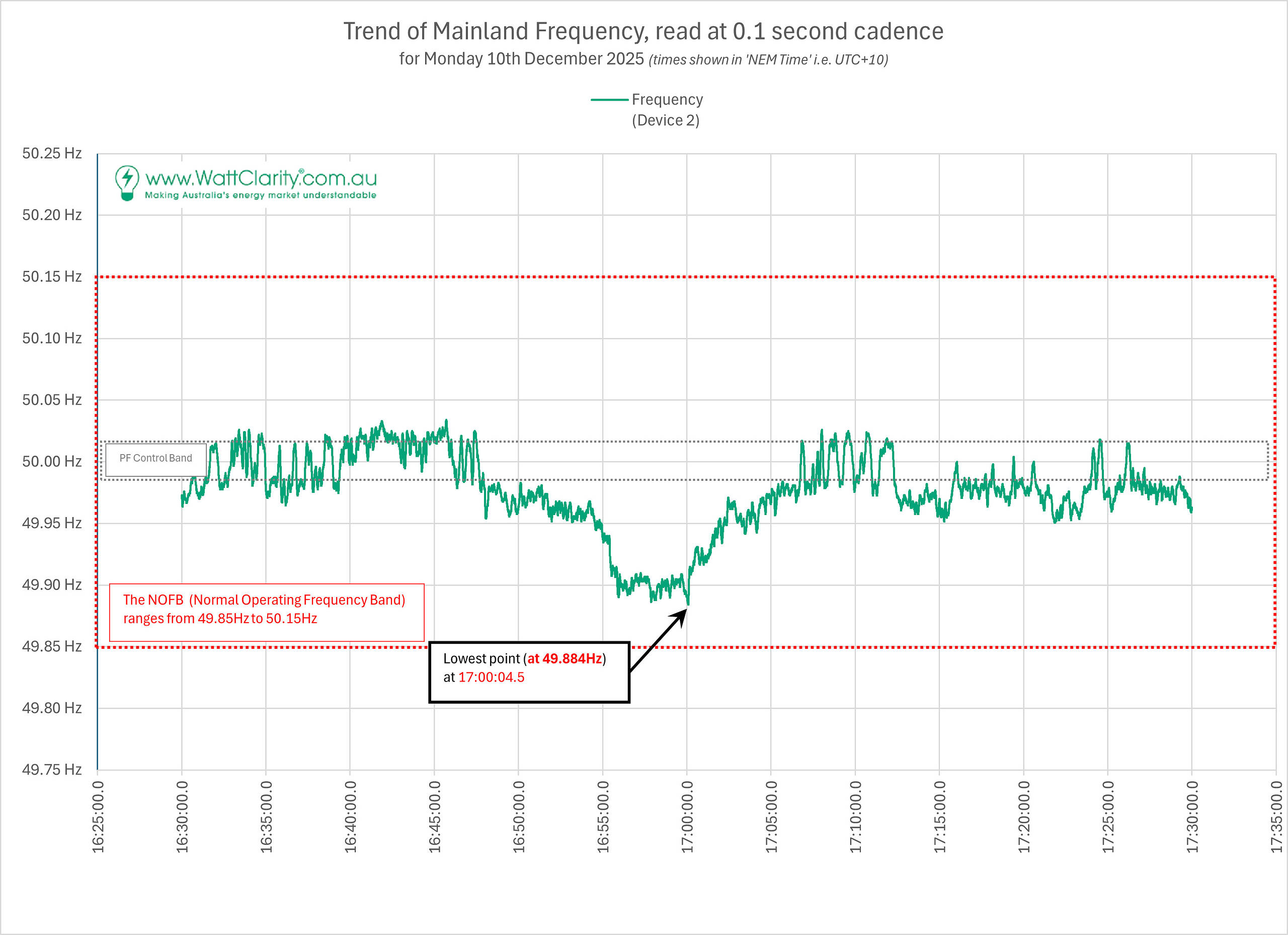 A quick article late on Wednesday afternoon 10th December 2025 with two charts from an extract of our higher-speed (i.e. at 0.1 second cadence) frequency readings from one of our devices in Brisbane: