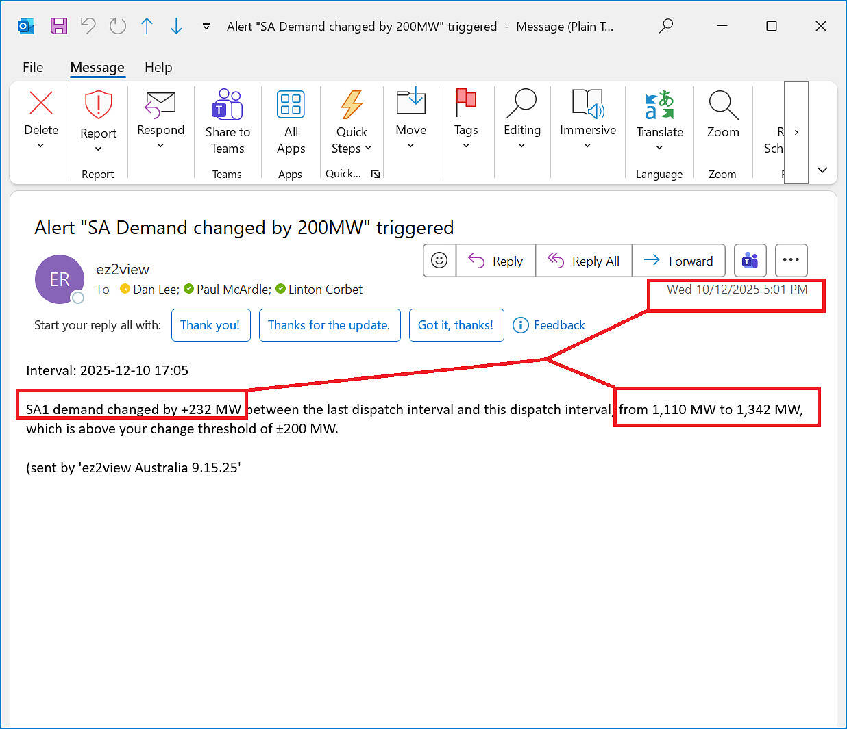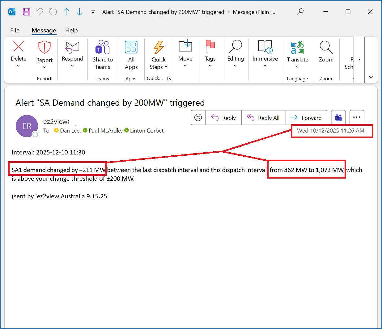 Within the ‘Notifications’ widget in ez2view, we’ve had an alert set up for many months now, looking at large changes in demand.  These alerts have been pretty quiet in prior years – but now in 2025: