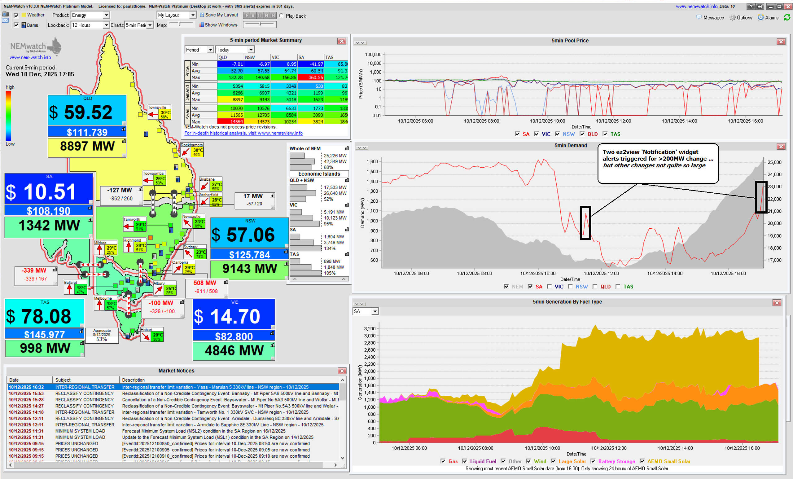 Both documents speak to the envisaged future challenges in the NEM related to this energy transition, whilst some of these challenges have already emerged and are growing – such as what happened in South Australia today, seen in this snapshot from NEMwatch at 17:05 (NEM time) on Wednesday 10th December 2025: