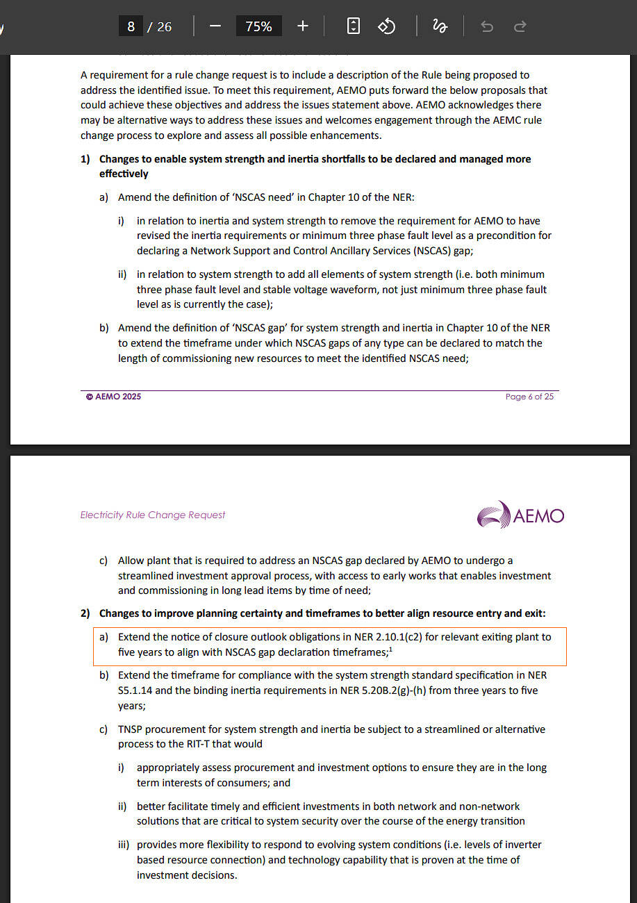 Pre-dating AEMO’s Monday release of its 2025 TPSS, but belatedly noting this here, is AEMO’s Rule Change Request titled ‘Efficient and timely management of system security needs through the energy transition’: