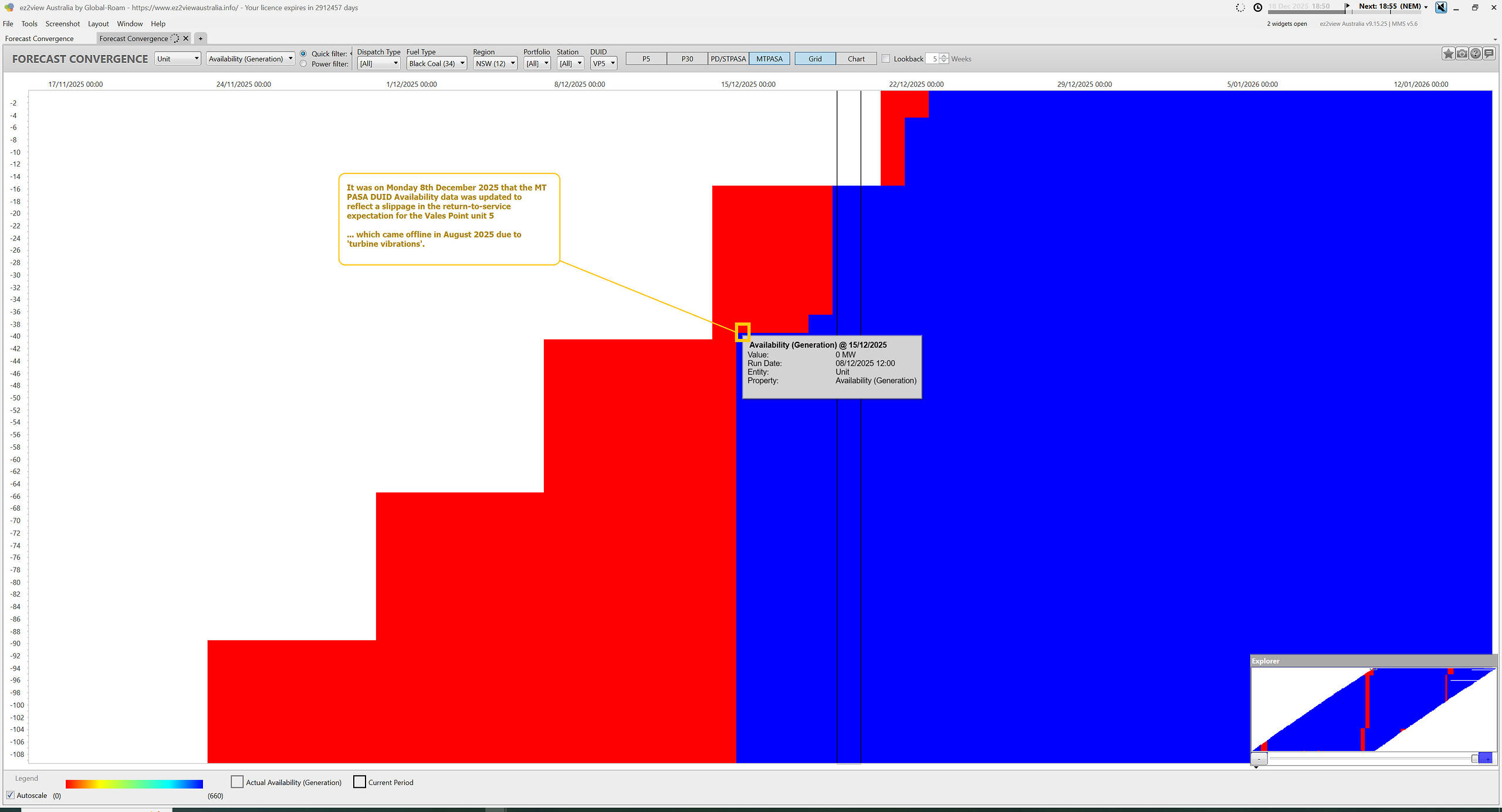 Firstly, with a view focused on the MT PASA DUID Availability data, we see the that it was last Monday 8th December 2025 that saw the return to service data pushed back the first time … but subsequently a couple of times since, as well.