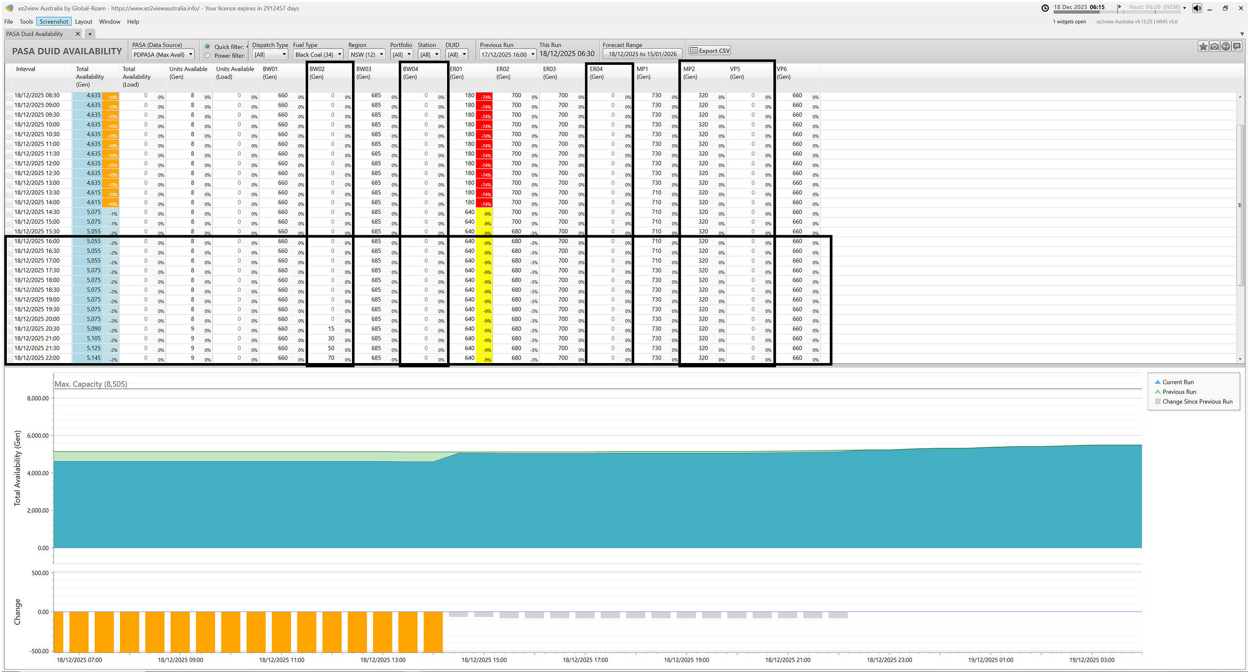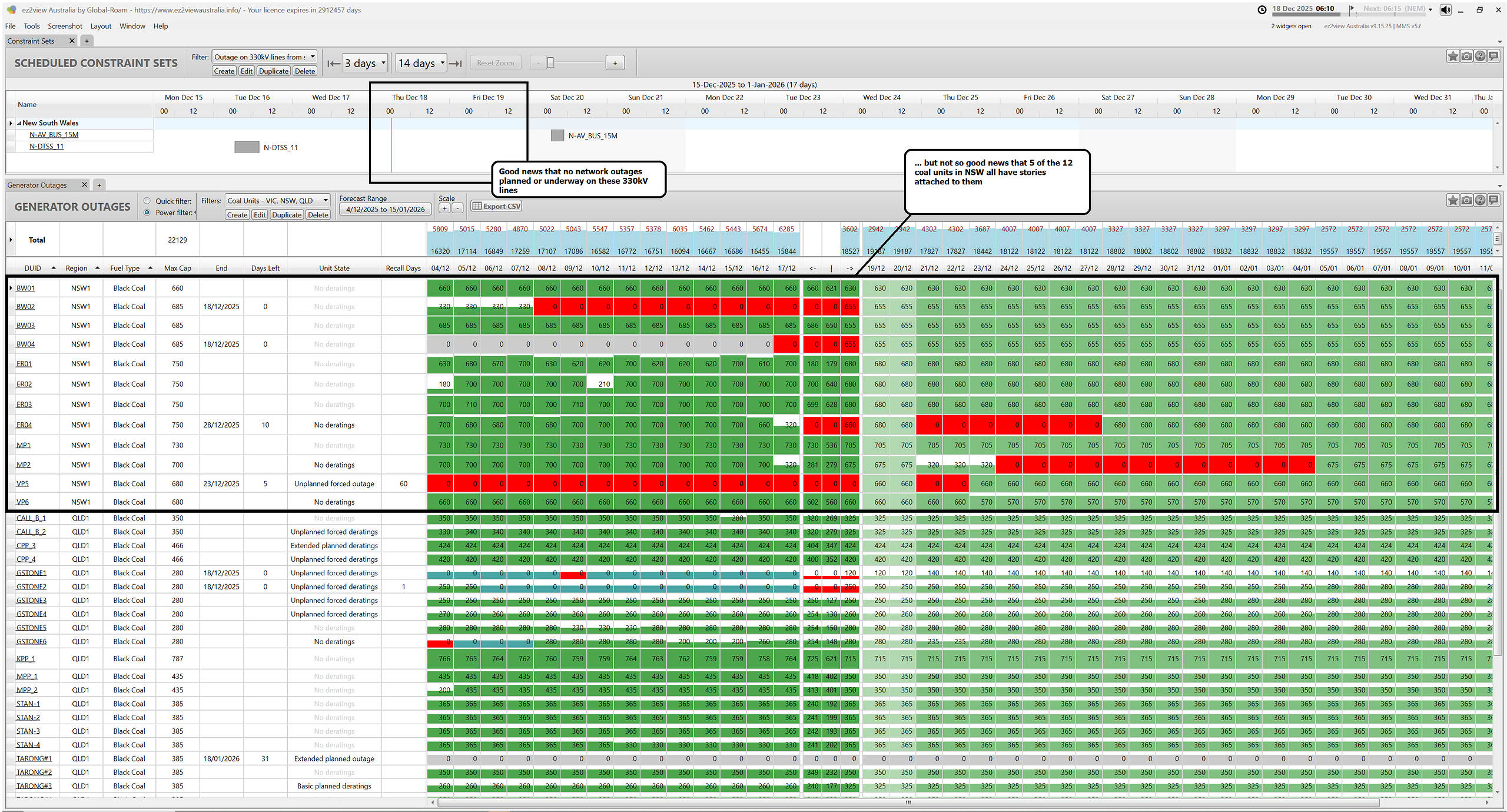 It’s understandable that we want to focus in on several different aspects of the supply-demand balance, so in this article we’ll include two snapshots of ez2view widgets early on Thursday morning 18th December 2025 to highlight what’s expected with the NSW coal fleet.