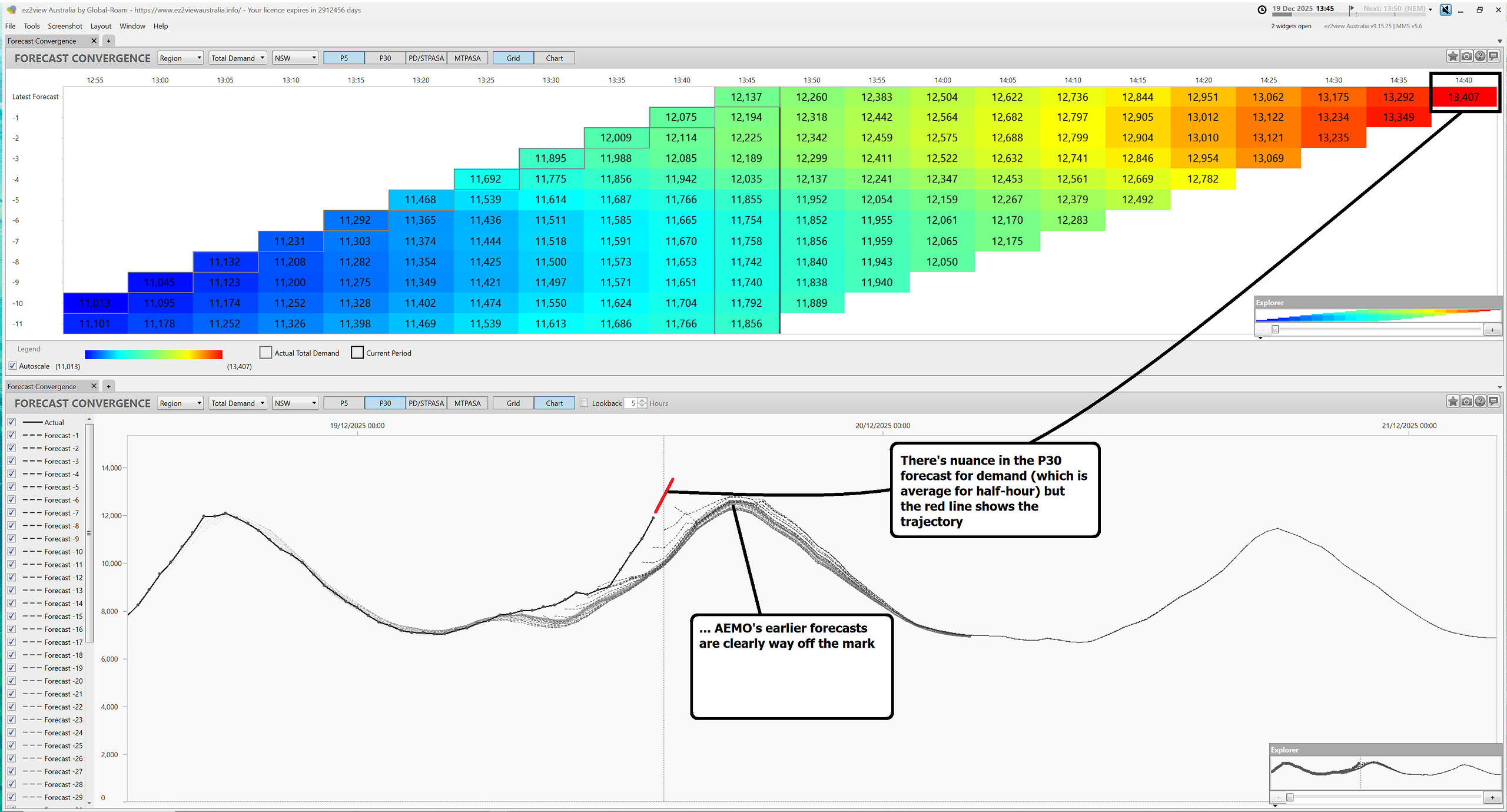 We can see the big discrepancy clearly in this collage of two instances of ‘Forecast Convergence’ in ez2view, focused on ‘Market Demand’ in NSW – the P5 forecast at the top and the P30 forecast at the bottom: