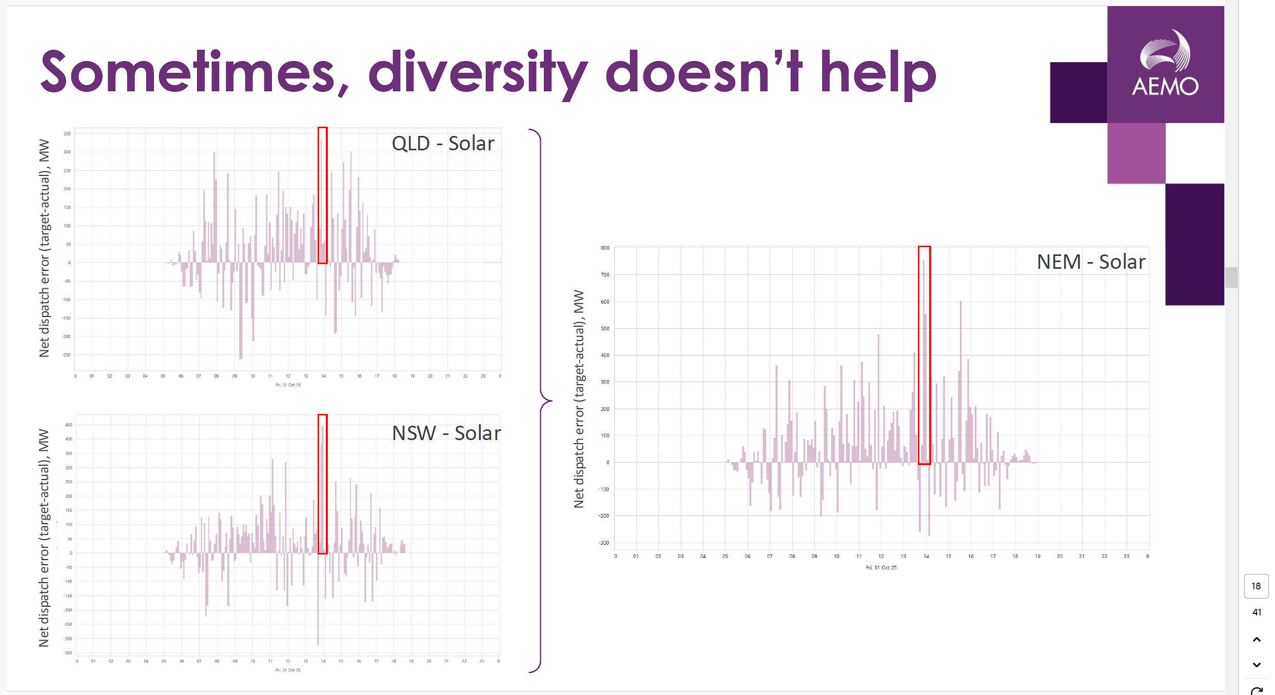 In this first of three slides, the AEMO points to coincidentally large Aggregate Dispatch Error(s) across Solar Farms in QLD, and in NSW: