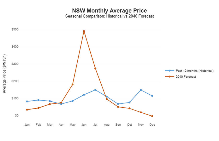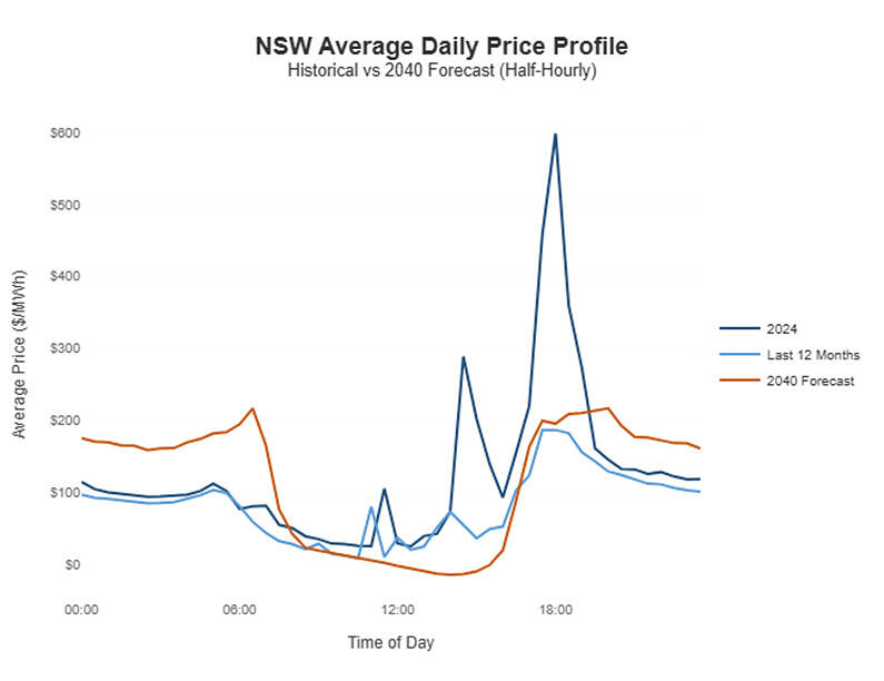NSW average intraday price profile: recent outcomes versus modelled 2040 post-coal prices.