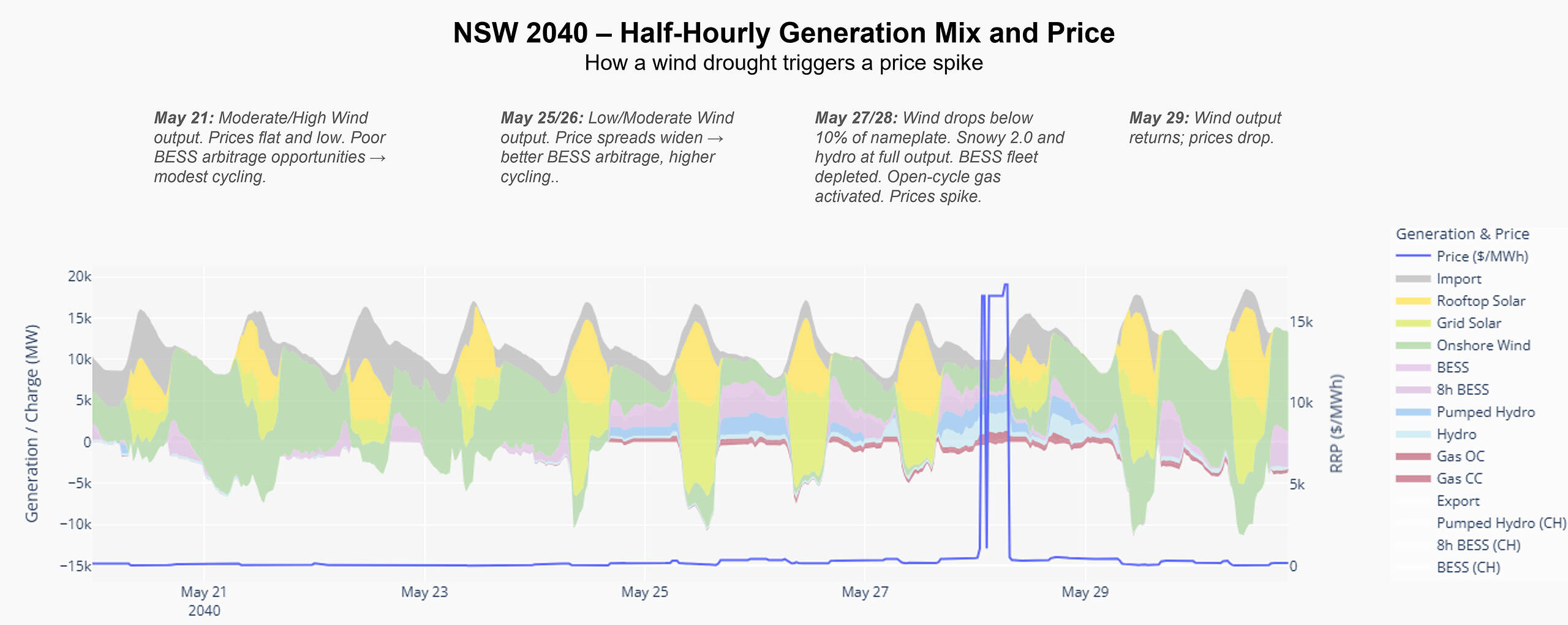 The chart below illustrates a common price-spike mechanism in our post-coal modelled NEM. A sustained drop in wind output initially widens intraday spreads, encouraging higher BESS cycling. As the wind shortfall persists, deep storage and pumped hydro are progressively dispatched and the aggregate battery fleet is materially depleted. Once stored energy is exhausted, peaking and reserve gas sets the marginal price, resulting in sharp scarcity-driven price spikes.
