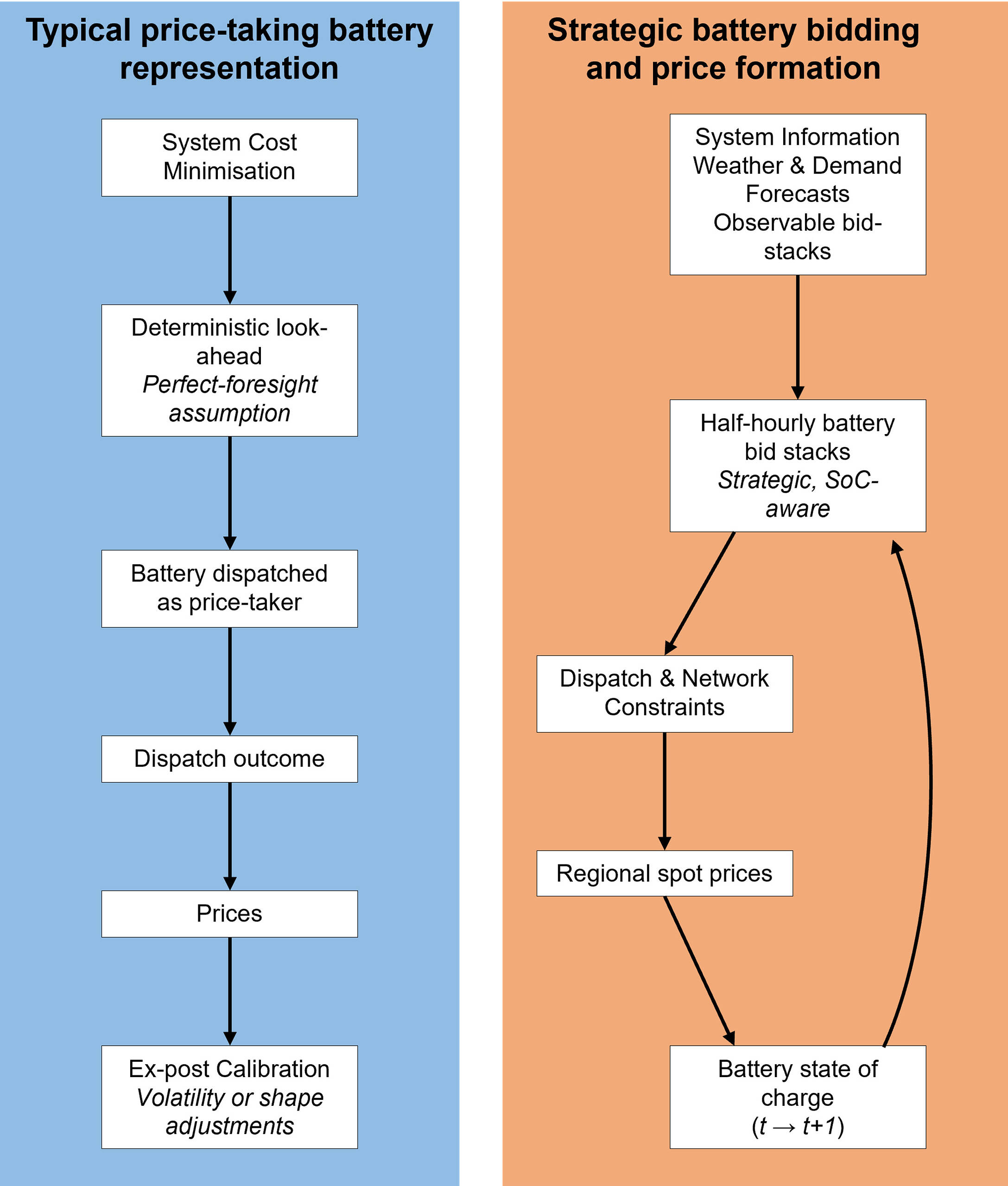 In our framework, battery state of charge is tracked through time, and charge and discharge volumes are determined endogenously via a proprietary bidding framework embedded directly within the dispatch optimisation. Rather than assuming batteries arbitrage a fixed price shape or applying volatility adjustments after the fact, we explicitly model battery bidding behaviour. Battery operators are assumed to act on information available in the real world – including weather and demand forecasts, and observable bid stacks from other participants – and dynamically position their charge and discharge bids accordingly, subject to physical energy constraints. Prices and volatility therefore emerge endogenously from the interaction of strategic bidding, intertemporal energy limits, network conditions and demand, rather than being imposed through calibration. As a result, battery behaviour materially influences both intraday price shape and system-level price formation.